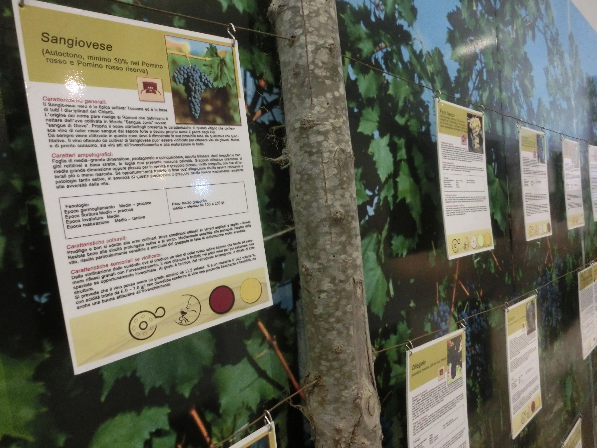 中は大きく分けて2つのホールに分かれています。1つ目のホールの左側の壁には、サンジョヴェ―ゼを杯目とする様々なブドウの品種の解説ファイル、中心には手作業で行っていた時代の器具などが展示されています。