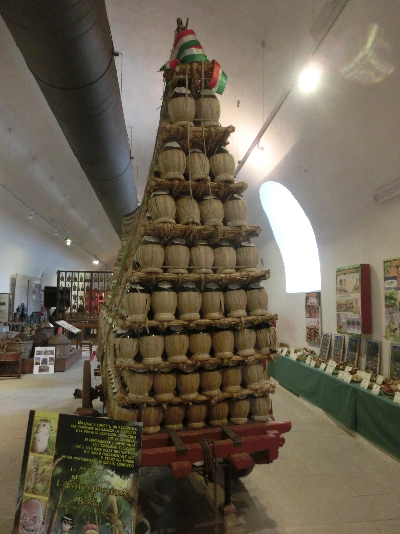 そして博物館最大の展示物は、この大きな山車!このような山車で、この地域の生産者がかつてフィレンツェに納品していたんです。現在でもこの伝統は9月最終週のワイン祭り「BACCO」で再現され、土曜日の昼にはこの「CARROMATTO」がシニョーリア広場にお目見えします。長さは約8m、2リットル入りのフィアスコが11段で合計2800本!これを積み上げるには15人もの男性が必要だったとか・・・当然ながら現在これができる人はたった数人だそうです。
