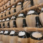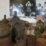 2つ目のホールの真ん中には、トスカーナワインのシンボルともいえる藁を巻いた「フィアスコ」が並びます。1900年代には近郊のポンタッシエーヴェでフィアスコの工場ができ、地元の女性が湿地に生える草を使って巻く作業をしていたそう~ワインそのものだけでなく、こうして付随する製品の産業も盛んになってくる様子が分かります。またフィアスコの棚の手前には、樽やモスト(ブドウの搾り汁)と組みだすポンプなど、ワイン醸造に係わるかつてのマテリアルや機械の展示や、その生産工程などを説明する写真パネルが展示されています。今の機会は全て電気式に変わり、その醸造方法も時代と共に革新されていきますが、ここにたどり着くまでの先人たちの知恵や労力を知るのは、とても興味深いことですね。