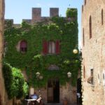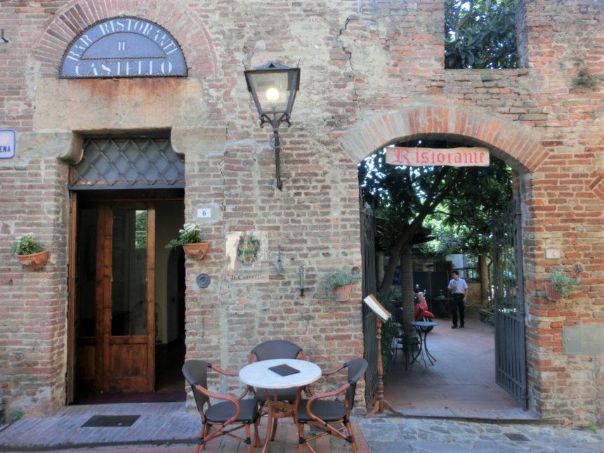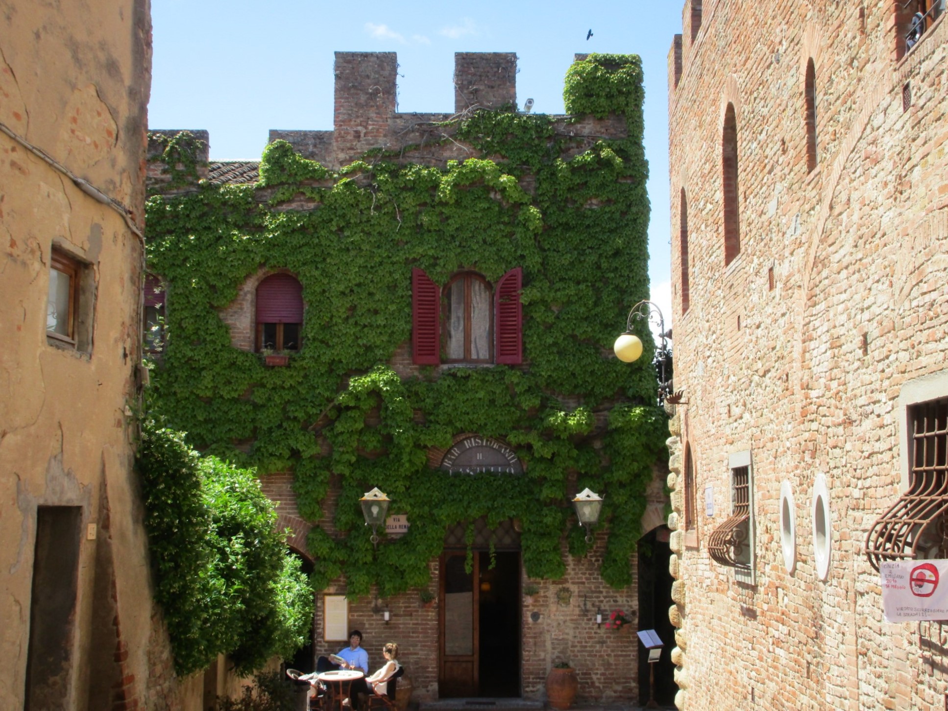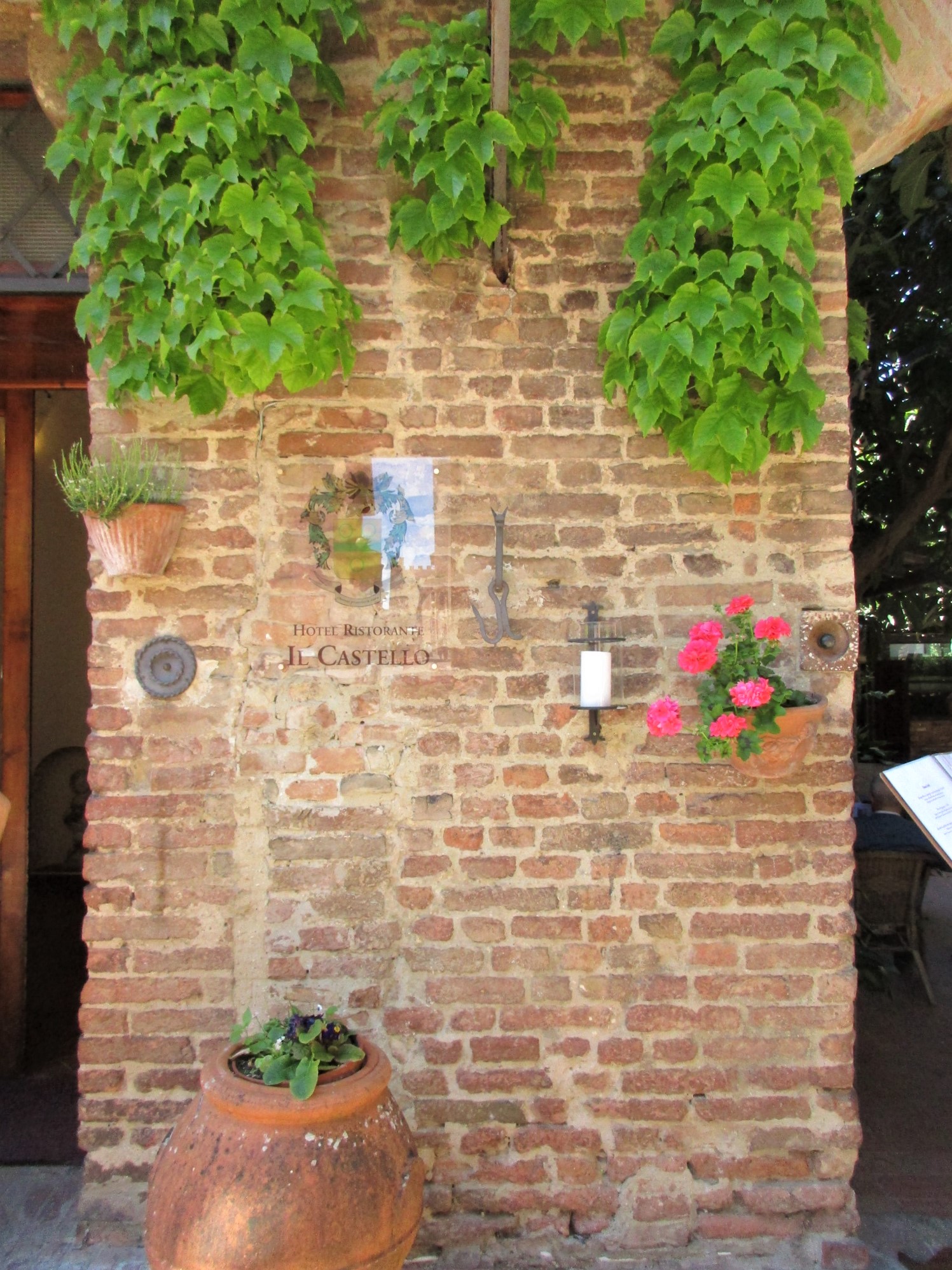 フィレンツェから簡単に行ける小さな村、チェルタルド。プレトーリオ宮と並ぶくらい、SNSでの写真でよく登場するチェルタルドのシンボル的な建物が、このホテル「Il Castello」、メインのボッカチオ通りの東の端がプレトーリオ宮、西の端がこのイル・カステッロです。ホテルの右側はお庭になっており、春~秋は併設のレストランのテーブルが並びます。パラソルや木の陰が爽やかで、ここから見るパノラマもとっても美しいですよ。