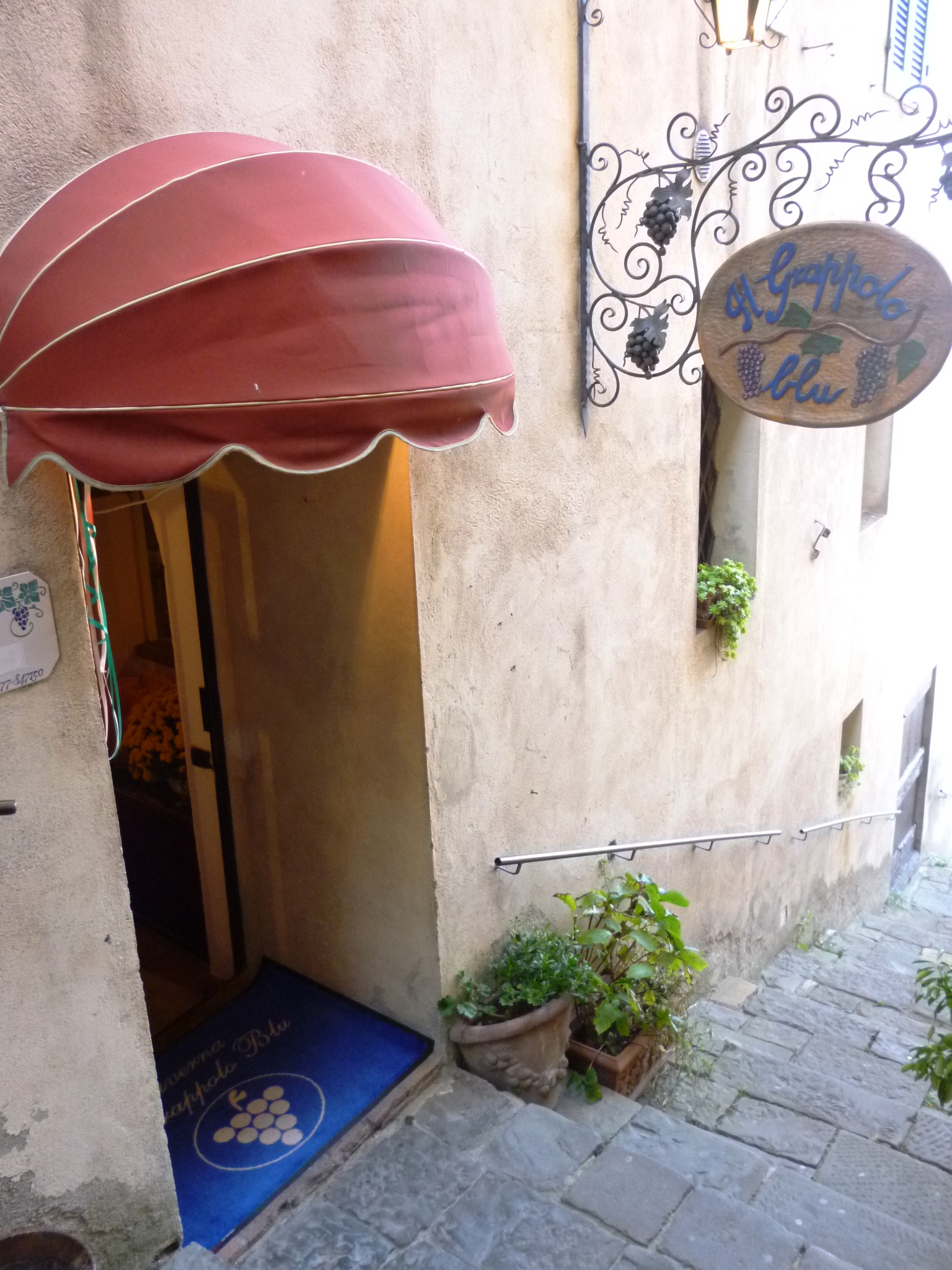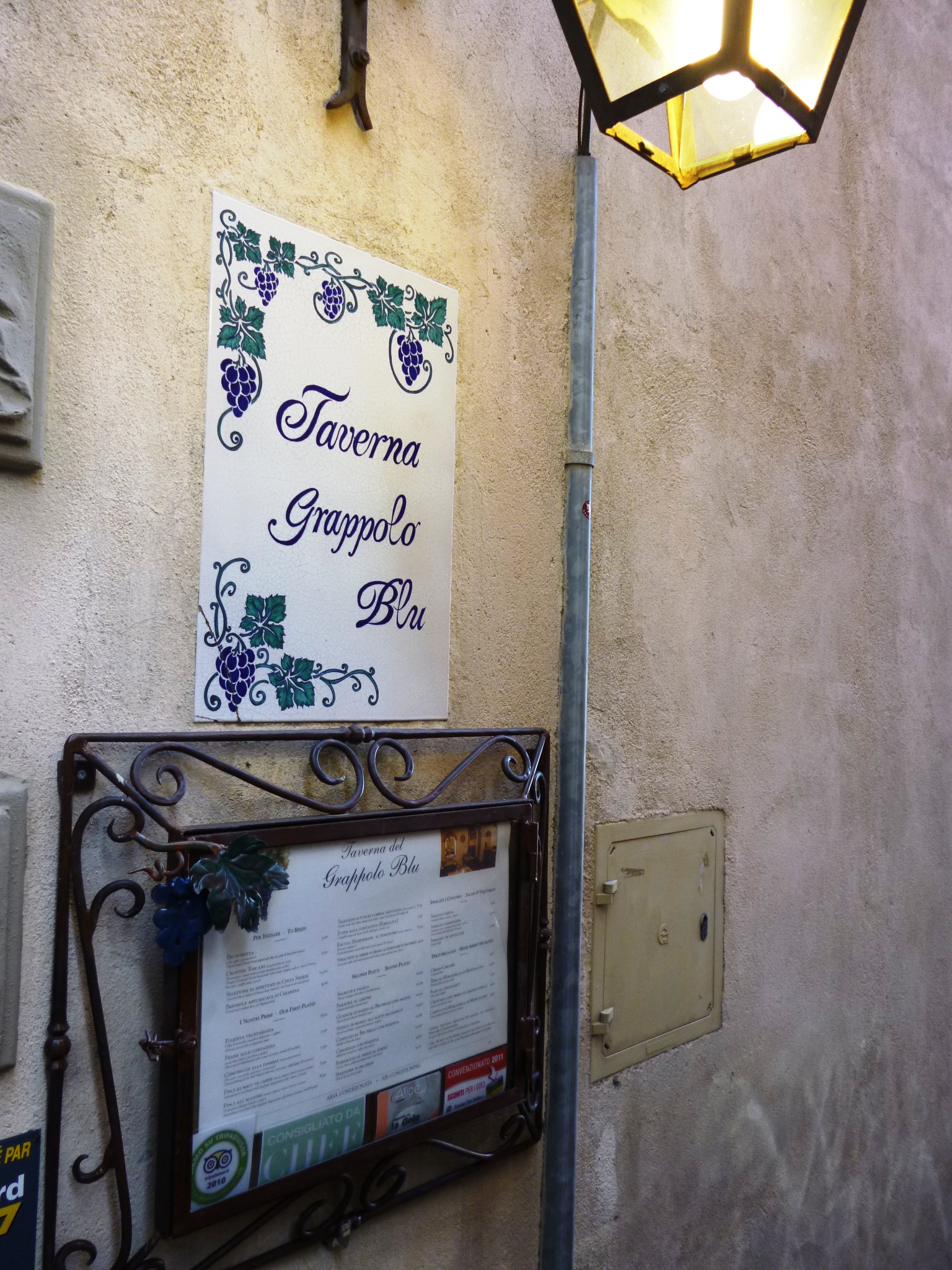 モンタルチーノ旧市街、細い路地を少し下ったところにひっそりとあるレストラン。名前はGrappolo blue =(葡萄の)青い房ってのがいかにもワインの産地らしいですね。過去に日本のフィガロにも紹介されたことがあるそうです。