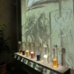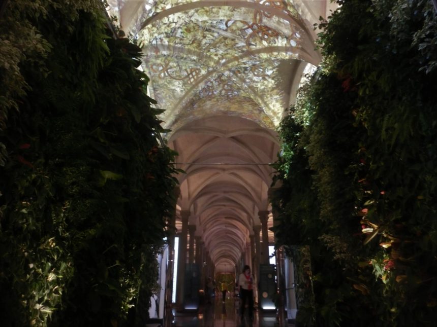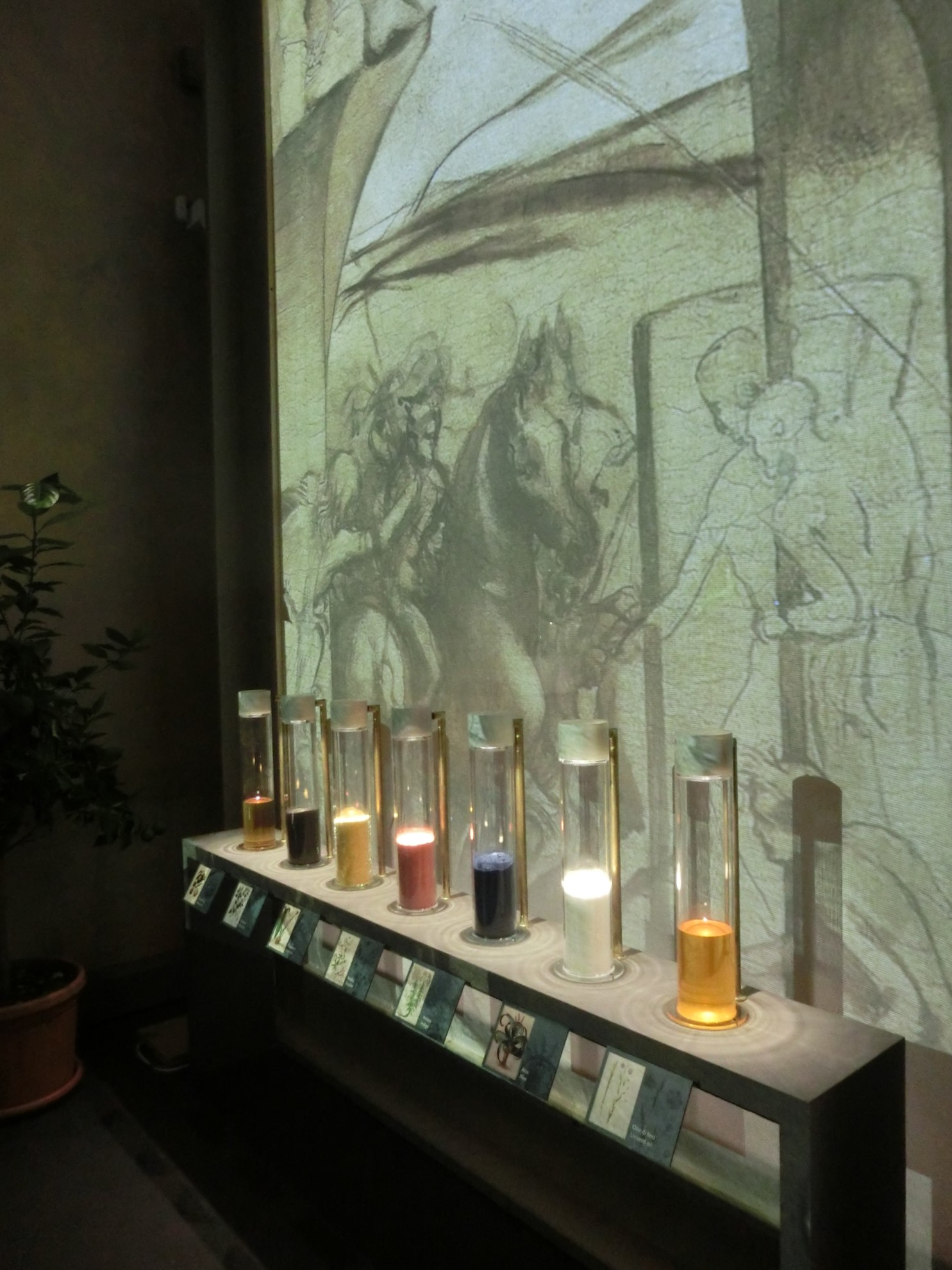 入口は薄暗く、手前天井に浮かび上がるのはミラノ・スフォルツァ城で最近修復が終わった「アッセの間」のフレスコ画(TOP写真)。そこに描かれているのは、桑の木・・・緻密に描かれた木は、まさにレオナルドの自然観察と、そこから考察された地球上の体系学なのです。