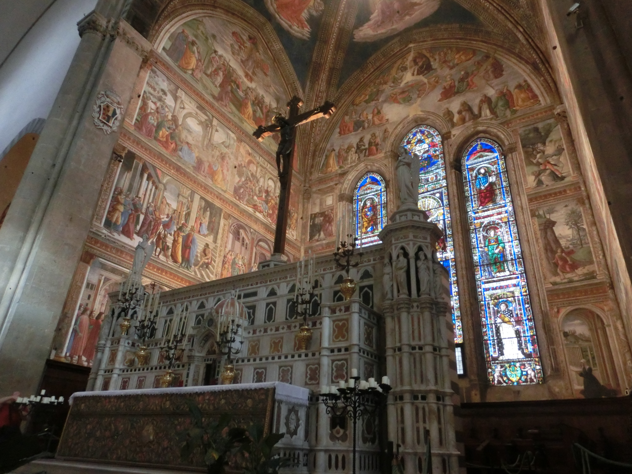 教会内は、言わずと知れた名作が数多く。教会中ほどには、ジョットの十字架像、マザッチョの「三位一体」というルネサンス初期の革命的な作品から、祭壇後ろにはギルランダイオ、その右横のストロッツィ礼拝堂にはフィリッポ・リッピのフレスコ画、祭壇左にはブルネッレスキの十字画像など、盛りだくさん。その他の写真は、下のギャラリーでご覧くださいね。