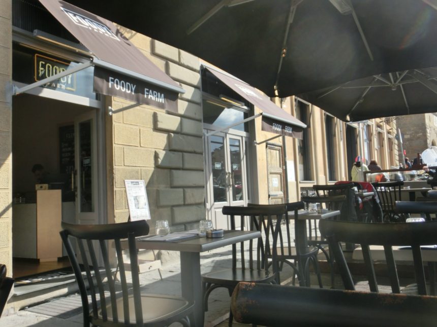 近年、アメリカ発のトレンドで注目されている、「FARM TO TABLE=農場から食卓へ」。食材の安全性や品質を厳選するのは、アグリツーリズモ(農家経営の宿泊施設)のレストランはもちろん、イタリアの一定レベルのレストランでは当たり前の気もしますが、そんなコンセプトを全面に出したレストランがフィレンツェにもできた!と聞いていました。とはいえ、あまり行かないゾーンで行きそびれていたのですが、最近サンタ・トリニタ橋の近くに移転したと聞き、友人とランチへ~お店の名前はFOODY FARM、ブランド通りのトルナブォーニ通りから近いこともあり、外側はこげ茶を基調にしたシックな外観。入口は2つあり、サンタ・トリニタ橋に近い方がレストラン、遠い方がバール(カフェ)になります。