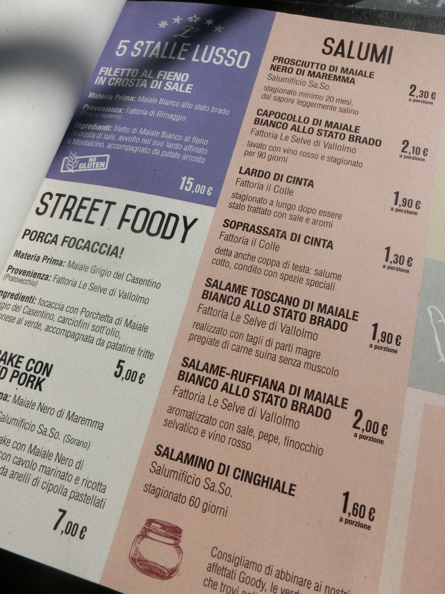 「素材が一番」と書かれたマットが、そのこだわりをがガツンとアピール。残念ながらメニュー自体には生産者のことは書かれてなかったのですが、サイトを見ると、北はエミリア・ロマーニャ州境のフィレンツォーラのオーガニック畜産組合から、南はマレンマの小さなパスタ工房まで、トスカーナの生産者がずらり。