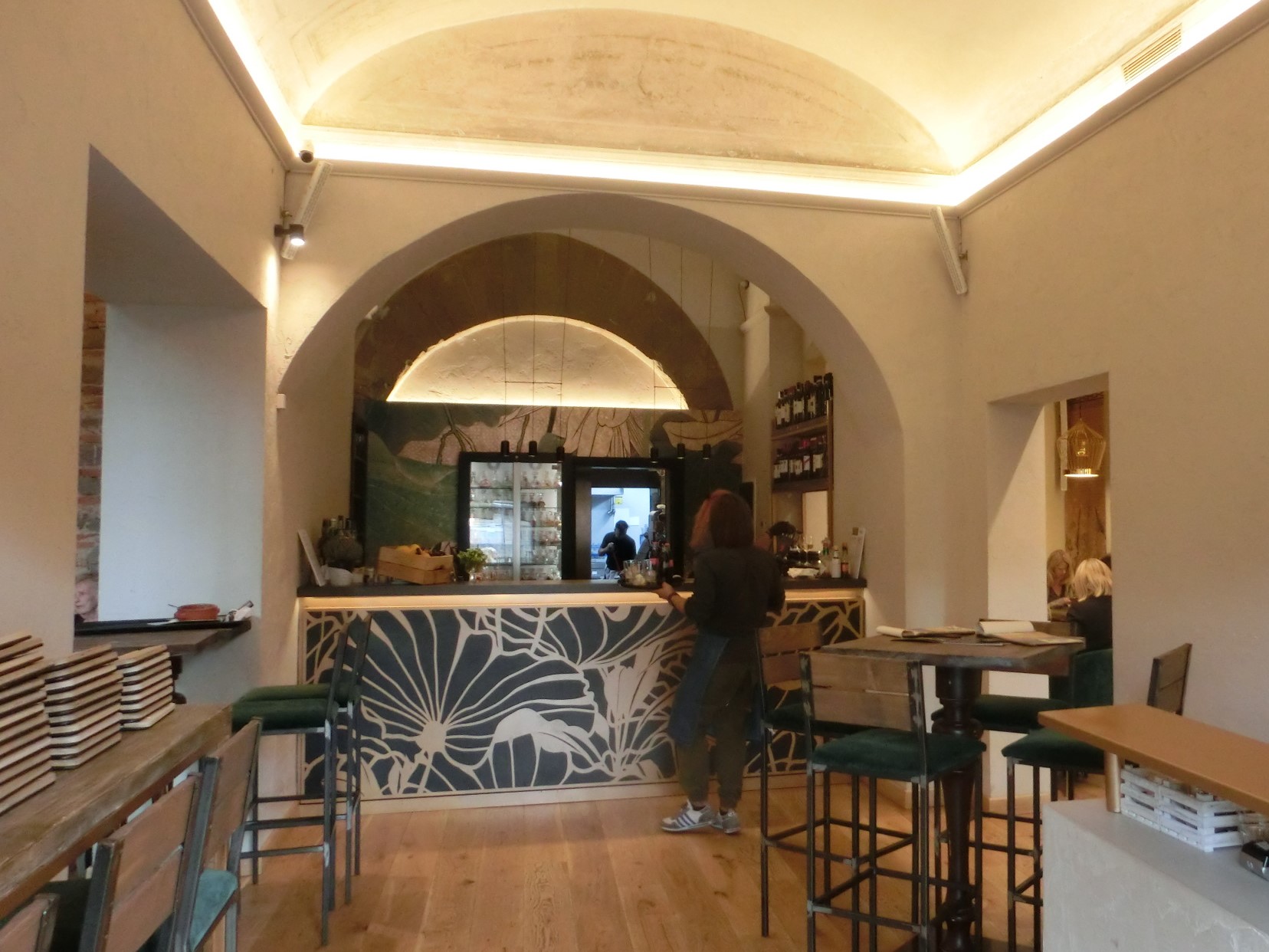 私たちは外席でしたが、中はこんなフレスコ画が残る高い天井、レンガを残した壁など、とても落ち着いた雰囲気。スタッフはみな若いですが、とても感じ良く好感が持てます。そして毎日営業&11時半~ノンストップで空いているので、イタリアの食事時間(ランチ:12時半~、ディナー:19時半~)より早く食べたい時もとても便利。朝早くは朝ごはんやお茶、深夜はお酒と、1日じゅう楽しめるお店でもあります。