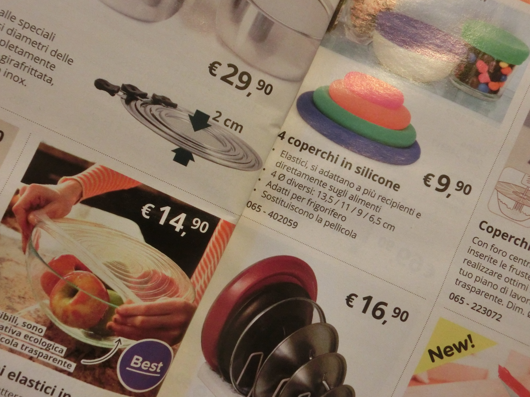 これはダンナがウケてたシャンプーハット。いっしょに4人で入ることないやろうから、4つもいらんやん?と思いつつも、単純に楽しいから良しとする(笑)。とにかく、こんな感じで買いたくなる&楽しい商品がいっぱいなので、店に入る時間がなくても店頭のカタログはとっておいて損はないです。イタリア語を学習している人は、生活の中で使う用語がいっぱいだし、単的な説明文なので学習の役に立つかも!オシャレなものも多いので、雑貨好きな人へのお土産を買うのにも良いですね。