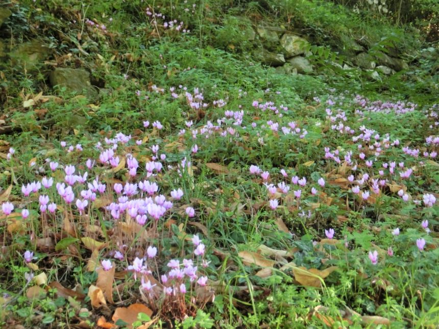 シクラメンの原種。昔は何かも分からないままだったけど、最近は小さな花を見つけてはじっくり鑑賞。そして植物博士のような人たちが集まる田舎暮らしコミュニティの仲間にいろいろ教えてもらって、これがシクラメンの原種と知ったのです。上の写真、ちょっとボケてるけど、「咲き乱れてる感」が出てなんか好き(自己満足・苦笑)