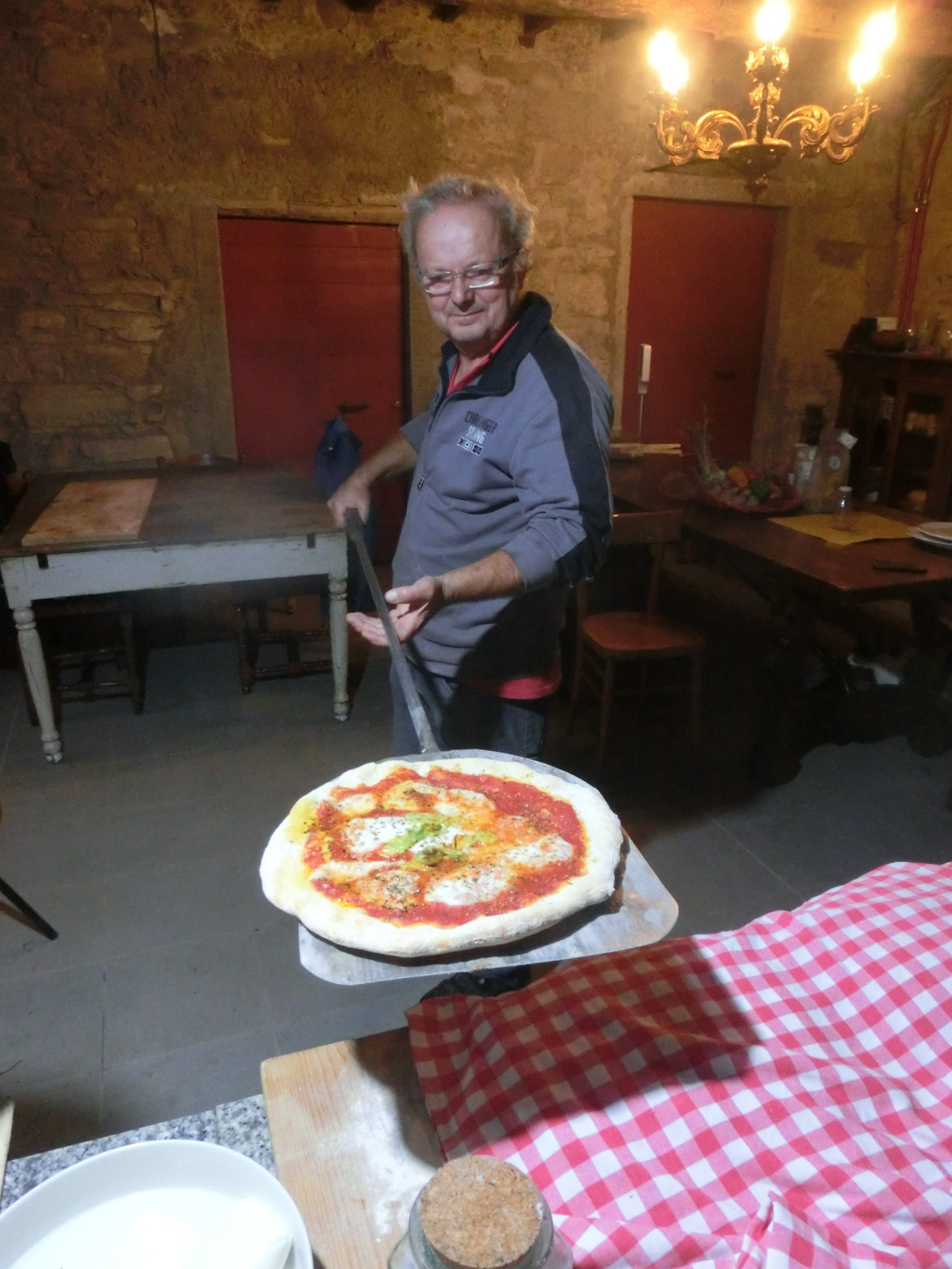 粉はもちろん、トマトピューレ、オリーブオイル、トッピングの野菜も自社製。先に火をおこしておいた、石窯で約ピッツァは最高!その他、固くなったパンとトマトで作るトスカーナ郷土料理、パッパ・アル・ポモドーロと、パスタ入りひよこ豆のミネストローネを作りました。