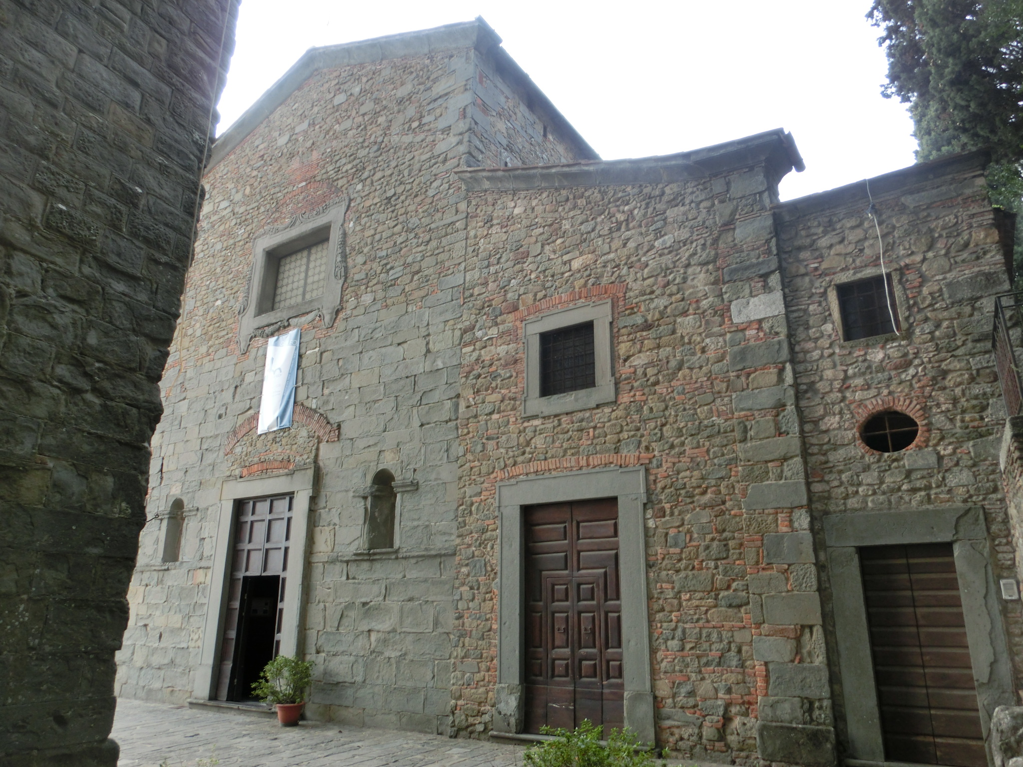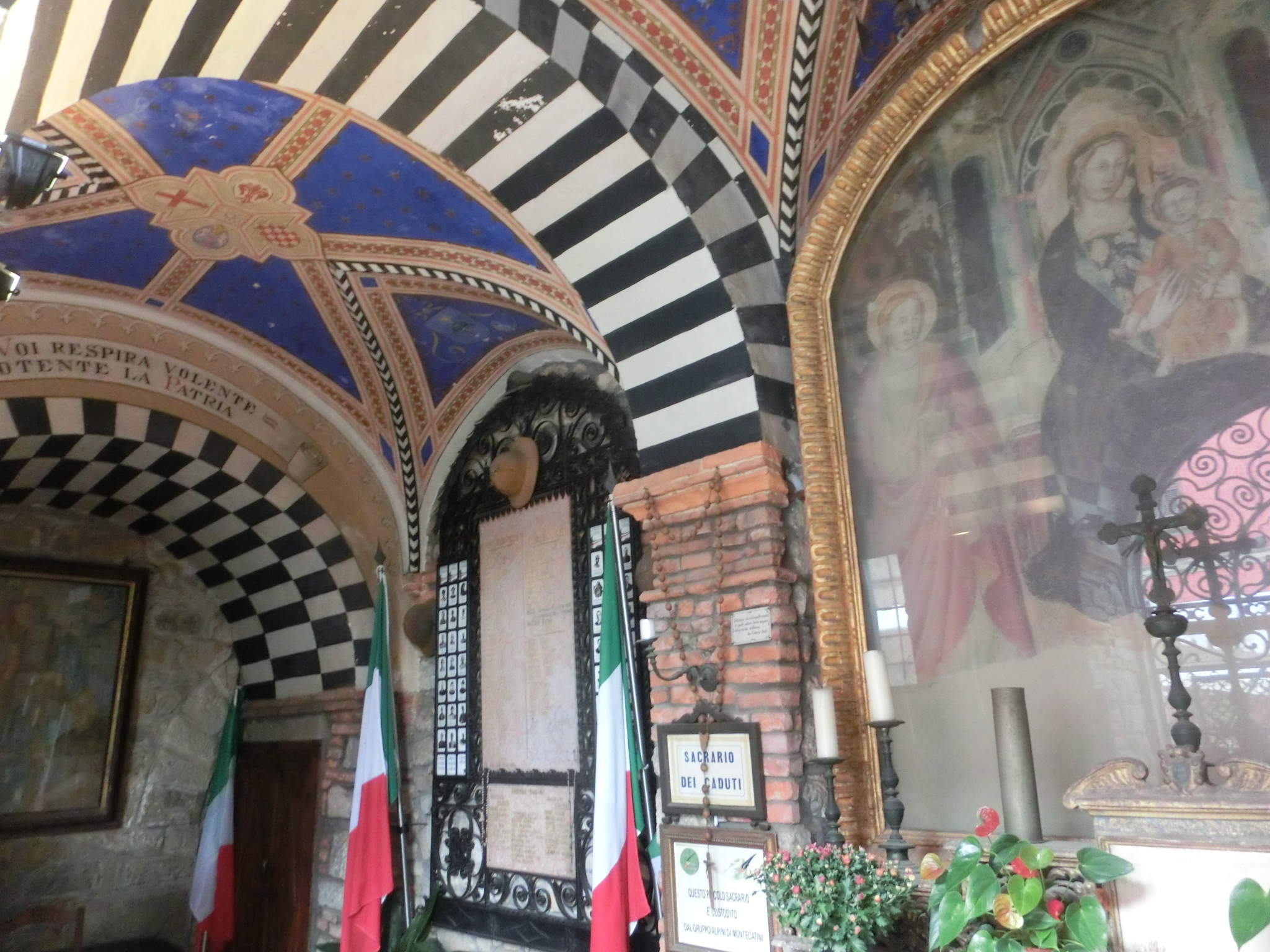 中は古いフレスコ画と、大戦の戦死者追悼碑があります。劇場まで来たら、まずは村の北側に行ってみましょう~坂を少し登ったところにあるのが、大きな鐘楼が目立つサン・ピエトロ教会と、古の要塞です。