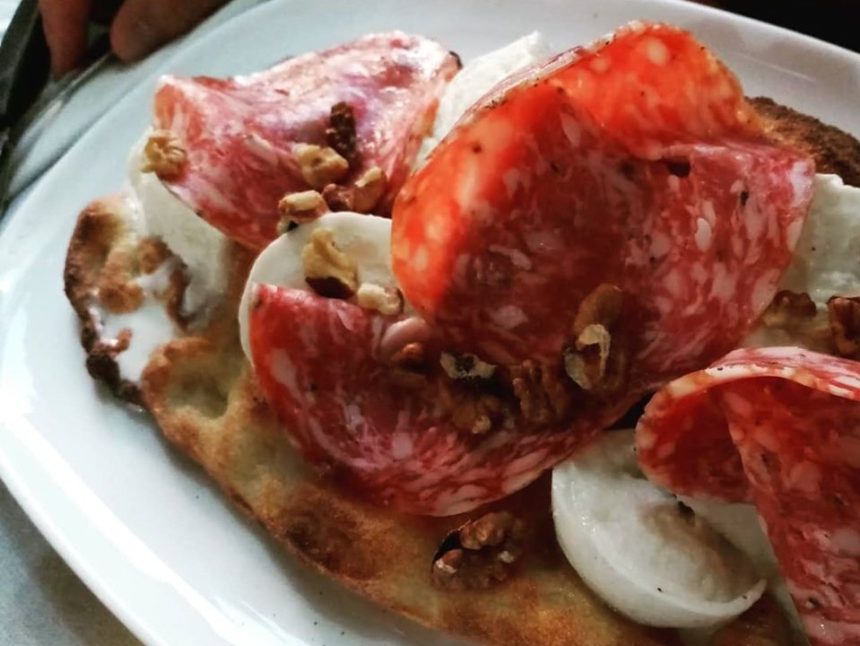 など、チーズだけのもの、具がデリケートで高級なもの、野菜でよく見られます。トマトソースの代わりにクリームチーズを塗ったものや、モッツァレッラとそれらの具だけで焼くものもあります。しかし、もう1つのバリエーションに最近ハマっている我が家。それは、具は生!TOP写真もその1つで、これはおらが村の新しいピッツェリア。米粉と天然酵母のピッツァで、具は水牛モッツァレッラとフィノッキオーナ、そしてクルミ~これが激ウマすぎて、ここに来るとこればっかり食べている私(笑)。