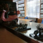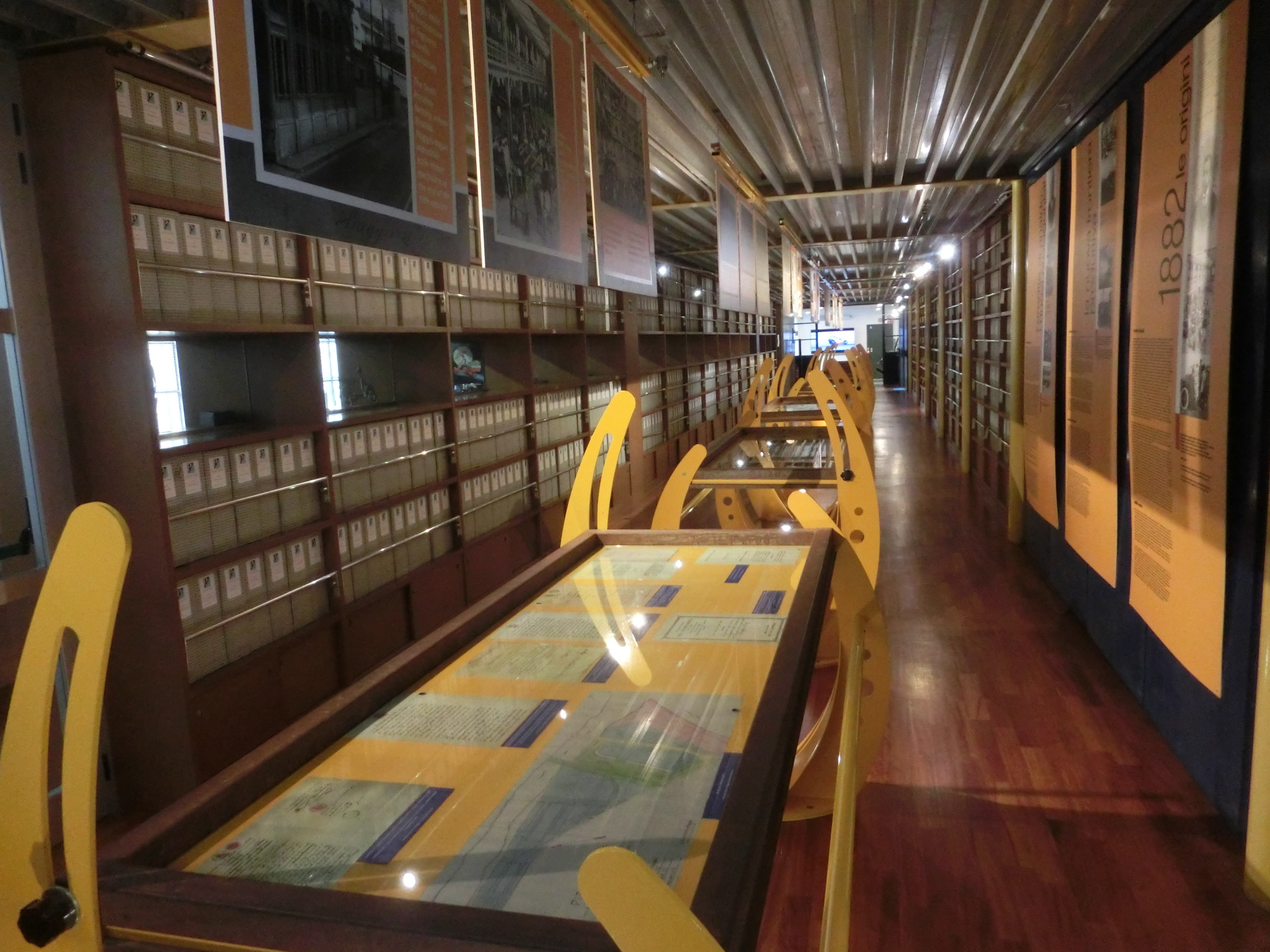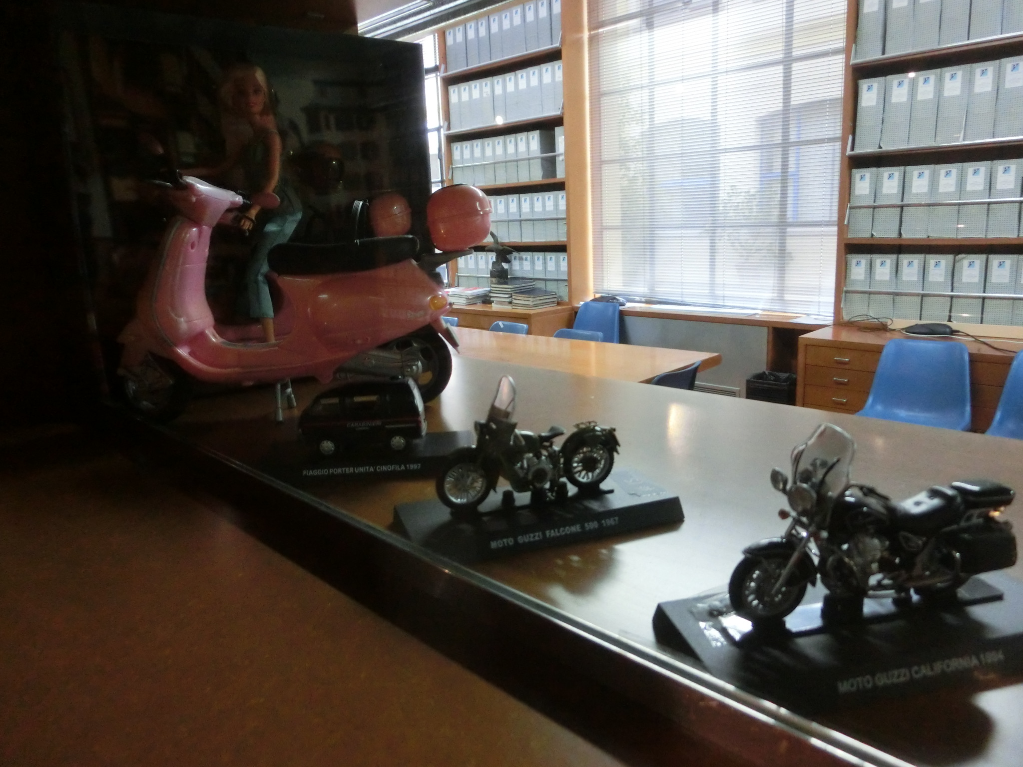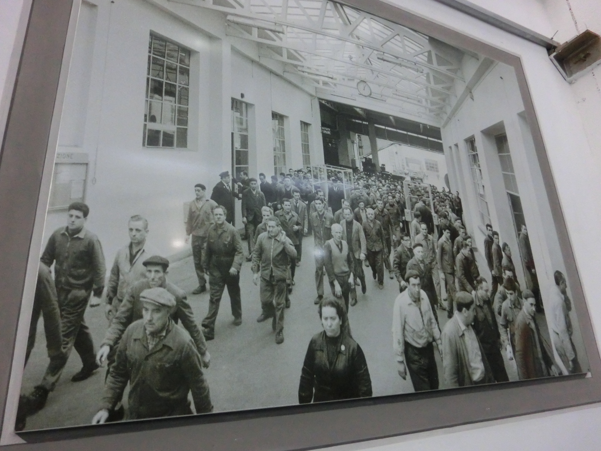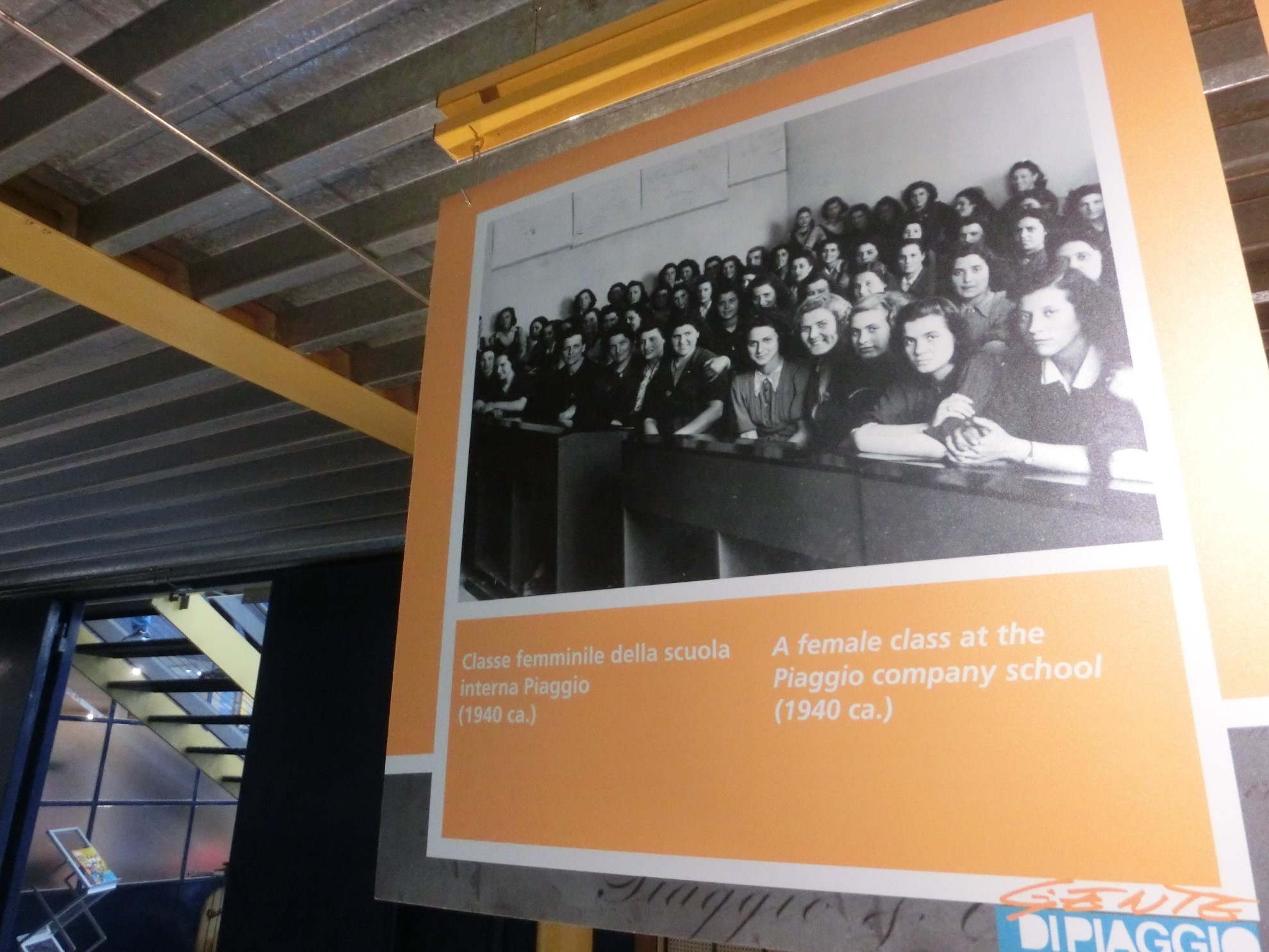 ヴェスパコレクションの横には、史料室が。ガラスケースには過去の資料や品々、そしてパネルには当時の会社や工場の写真が掲げられています。写真はヴェスパ生みの親・エンリーコ・ビアッジョ。ヴェスパの、ピアッジョの歴史と言うよりも、戦後イタリア産業史にまつわる貴重なものばかり。工場内に従業員の子供が通う学校を創設するなど、家族まるごと面倒を見るこの地域一番の企業であり、かなり進んだ会社経営だったことも分かります。