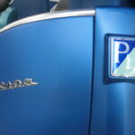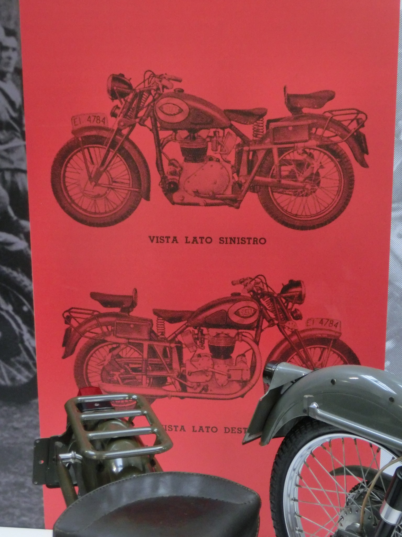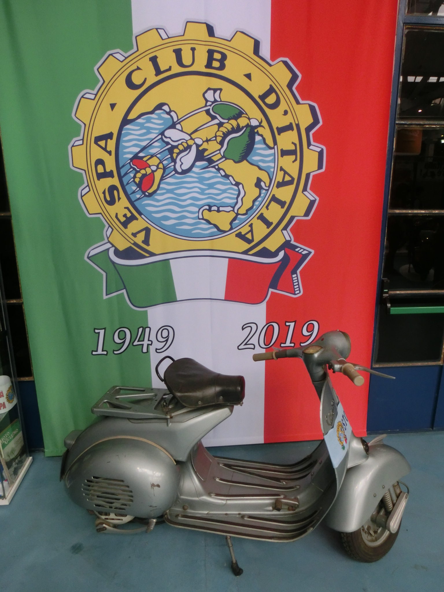 第二次大戦後、エンリーコ・ピアッジョはドイツ軍に占拠され被弾した工場を立て直し、戦後のイタリアで「1人乗りで安く動ける車両」を模索します。その第一段が1944年に誕生した、この「パペリーノ=あひる」。しかし、これではスカート女性はまたぐことはできない・・・その問題を解決したのが、1930~40年代に活躍したエンジニア、レンツォ・スポルティ。座席前にあったモーターを後輪脇に着けることによって、座席前に空間を設けたのです~これが、あのヴェスパの誕生につながります。