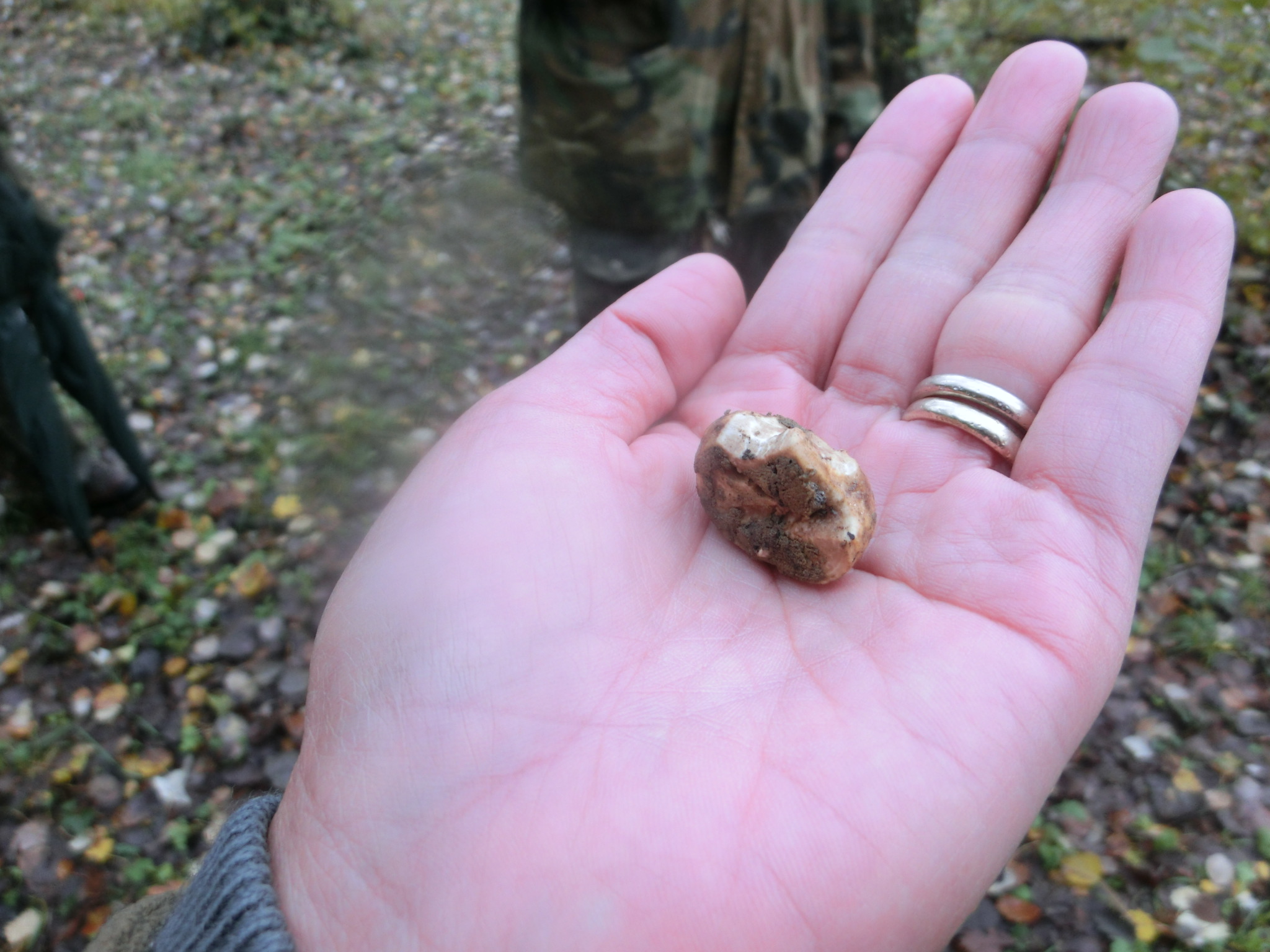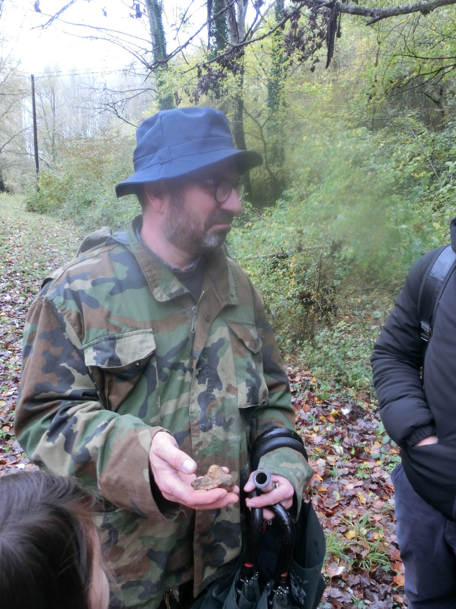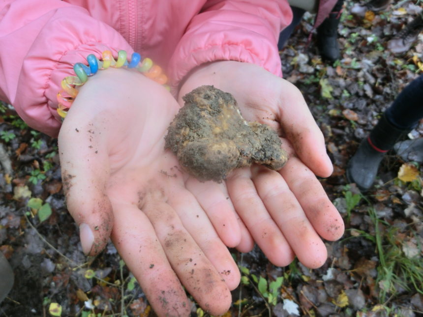 そんなことを話してる間に、もう1つ採ってる!しかも最高級の白トリュフ!!トリュフ自体は1年を通じて採れますが、時期によって種類が変わります。この白トリュフは11月だけのお楽しみ~。トリュフはきのこの一種で、時期になると一定の樹木の根っこにたった1日で形を形成するそうなんです。ただ土の中にいて、ある時期になると豊かな香りを発するので、ここにトリュフがある!と分かるわけです。