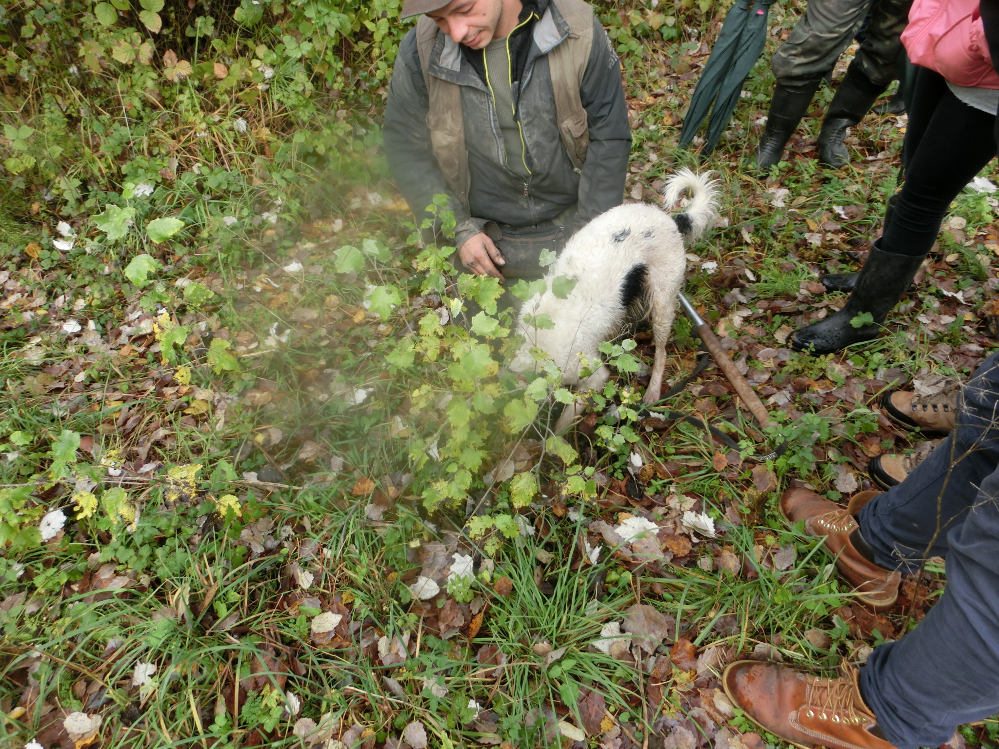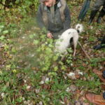 森と言っても、とても整備された平地なので、一般の人でも滑りにくい靴さえあればOK(この日はぬかるんでいたので、皆でゴム長靴を借りました)。訓練を積んだシンミアはメスの2才半。訓練も、そして本番も、飼い主との信頼関係が欠かせません。もうアレッサンドロが好きで好きでたまらない!というのが全身かあふれ出ていて、めちゃめちゃ可愛いんです。