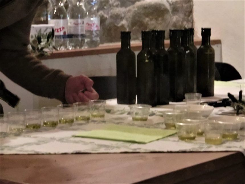 場所は、最近修復の終わった建物の1階。看板も何もないので誰の所有かはわからないのですが、構造のレンガをそのまま見せた壁、アーチなど、昔ながらの作りを生かしつつモダンに仕上げていました。基本、9月の桃のコンテストと同じで、午前中に専門家によるテイスティングが行われ、この年一番のオイル・生産者が決定します。司会とかそういうのは全くないものの、一応誰でも入って見ることは可能です。11本の番号だけ書かれた同じ瓶を、1本1本慎重に香り、味を確認していくのは4人の審査員の方々。