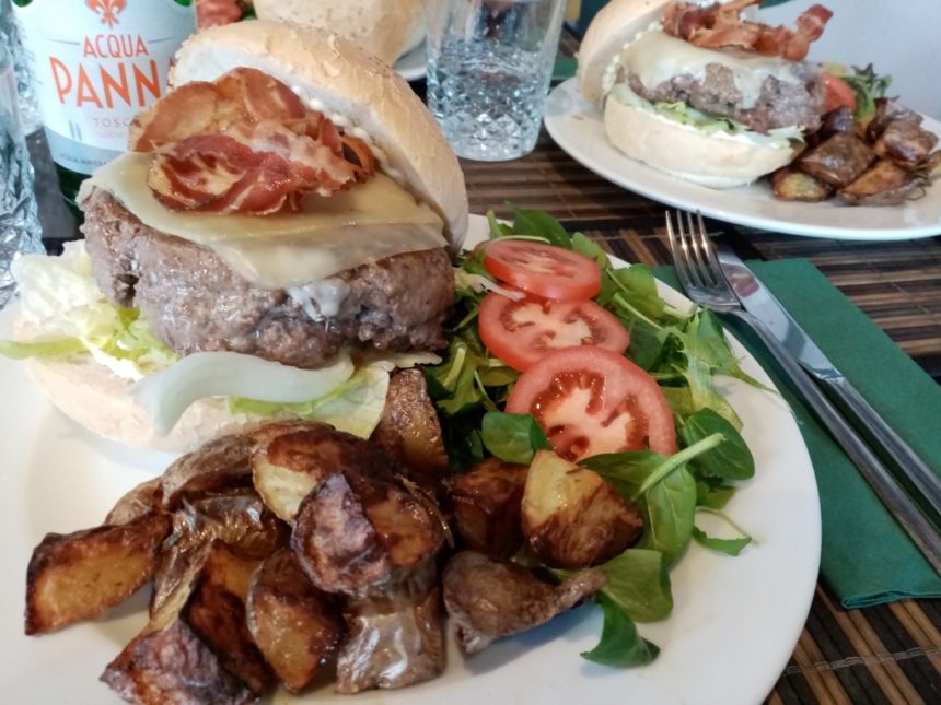 それほど身近なので写真もほとんどないのですが、入ってすぐはカウンターとハイスチールのあるテーブル2つ?左隣にテーブル席が20席くらいかなぁ?こじんまりとして居心地の良い空間で、ランチは品数は多くないものの、パスタ系からメインまでしっかり食べられます。その中でも皆のお気に入りが、この「ガーデンハンバーガーセット」、このボリュームでたったの10ユーロ!ハンバーグの厚みは5㎝?それにカリカリベーコン、卵、レタスも入って、当然かぶりつくなどはできず、ナイフとフォークで解体しながらいただきます。これだけ厚みがあっても、中はうっすらピンクの完璧な焼き加減!そしてこの皮つきポテトのオーブン焼きが最高においしく・・・食べ終わるのが大変なくらい(でも完食しますけど・爆)のコスパな最高なバーガーセット、最近はマグロステーキバーガー