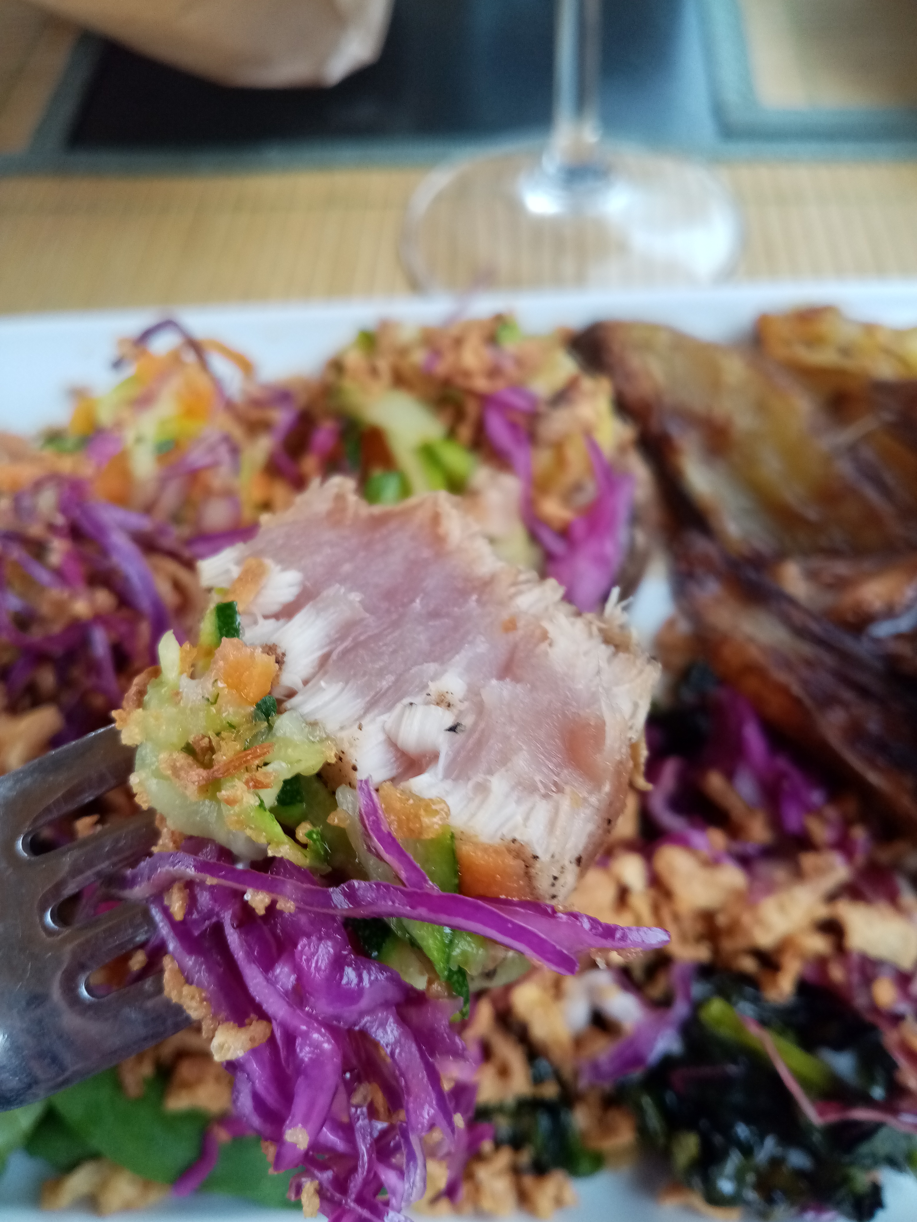 マグロ見えませんが(笑)、カリカリパンと赤キャベツ、黒キャベツの炒めたのが乗っていて、一緒に食べると美味しい!マグロも完璧に半生でたまりません~断面写真は、下のギャラリーでどうぞ!