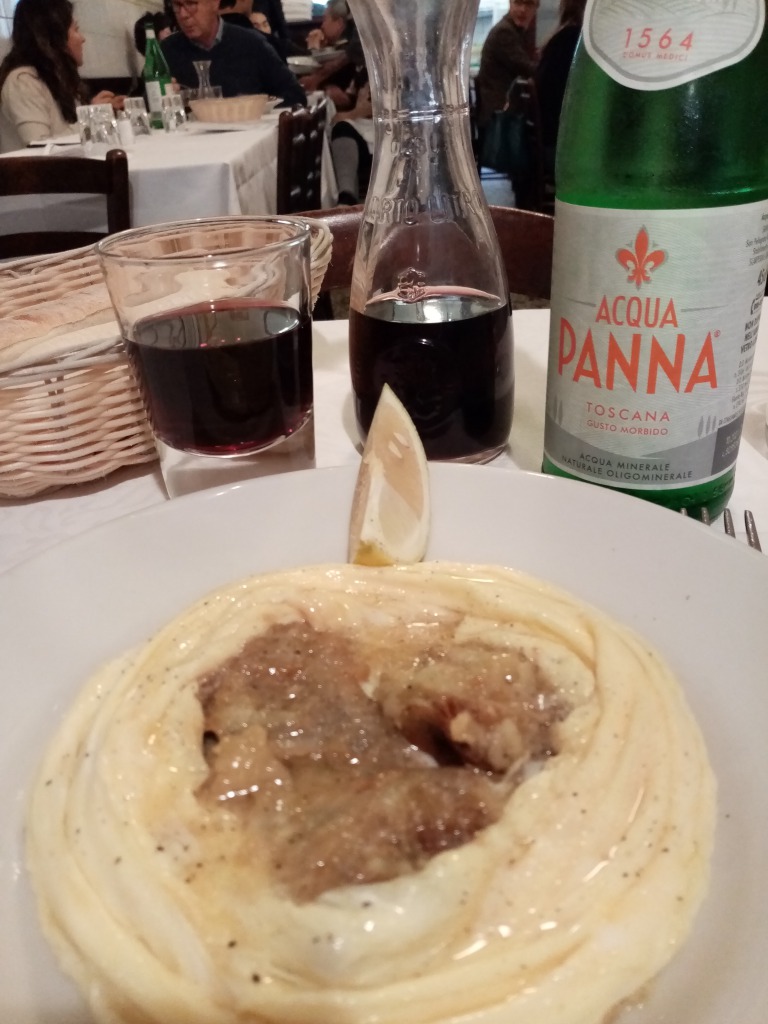 卵は見た目通りふわっふわで、完璧な日の通し具合。アーティチョークは先に火を通していますが、味付けは塩のみ・・・食べる前に、お好みで黒コショウ(給士係のお兄さんが挽いてくれます)、添えてあるレモンをキュッと絞って。16ユーロと安いものではありませんが、これを食べるために来たのだし、これだけでそれなりにおなかいっぱいになるので、それで良し。でも次回は、「昔ながらの焼き方のビステッカ」や、「柔らかい鶏肉のバターソテー」とかも食べてみたいので、複数人で来ていろいろシェアしたいです。