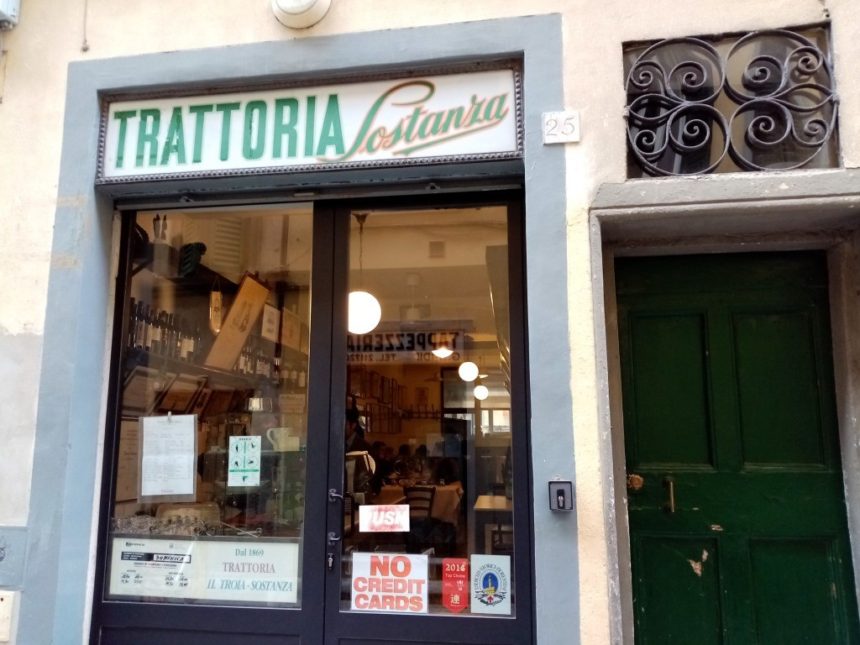 フィレンツェのレストランに詳しい人なら誰でも知ってる?昔ながらの名店、トラットリア・ソスタンツァ。1869年、パスクアーレ・カンポルミにより、オステリア・ワインや食材販売店として創業、カンポルミ家代々引き継いできましたが、1977年よりその伝統を従業員が引き継いできています。オンニサンティ地区の路地にあり、狭い店構えを入ると一昔前にタイムスリップしたようなレトロな雰囲気。スタッフはおそろいのジャケットを着た男性で、にこやかに丁寧に接客してくれます。