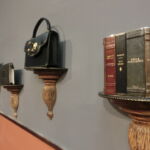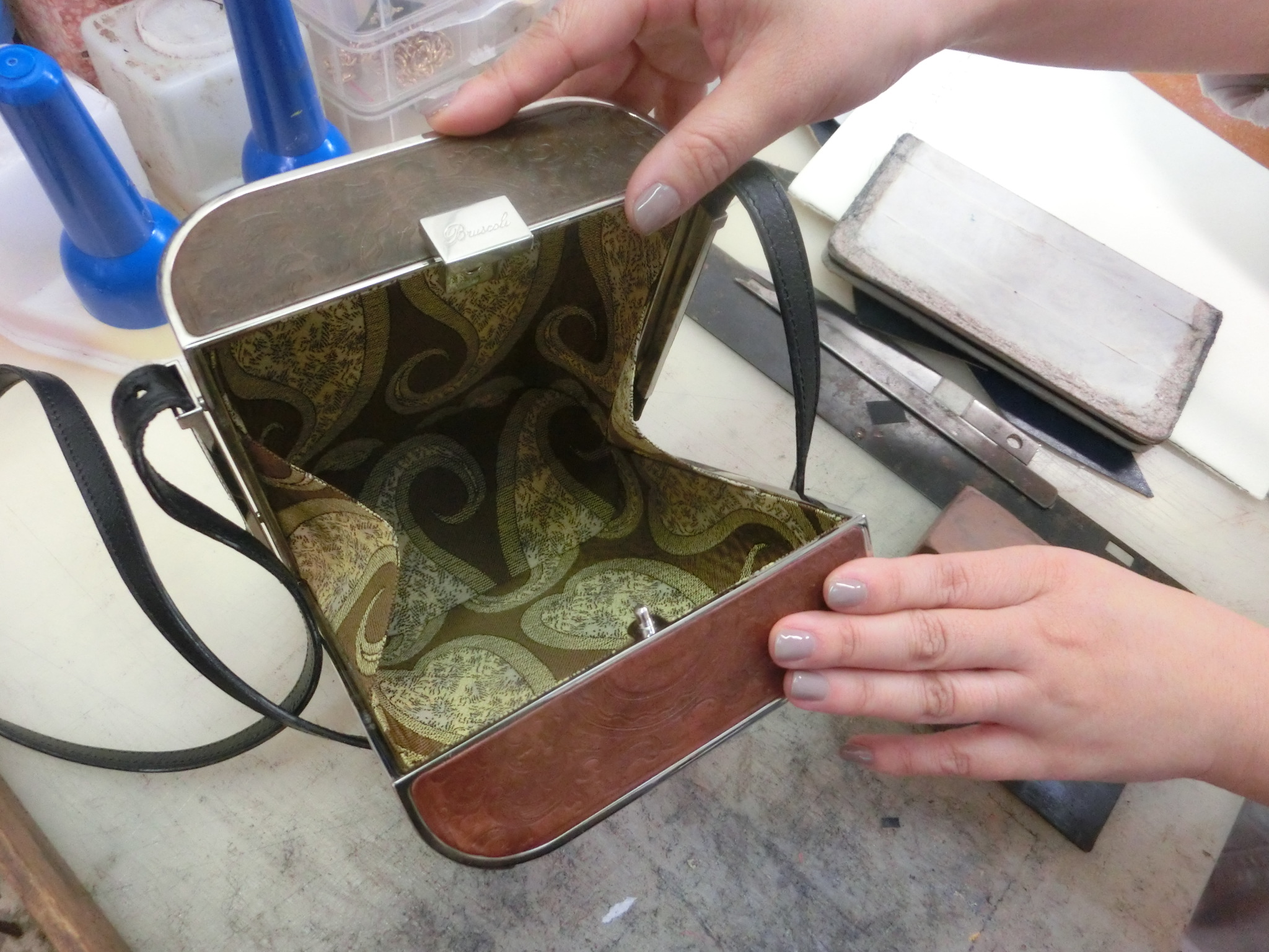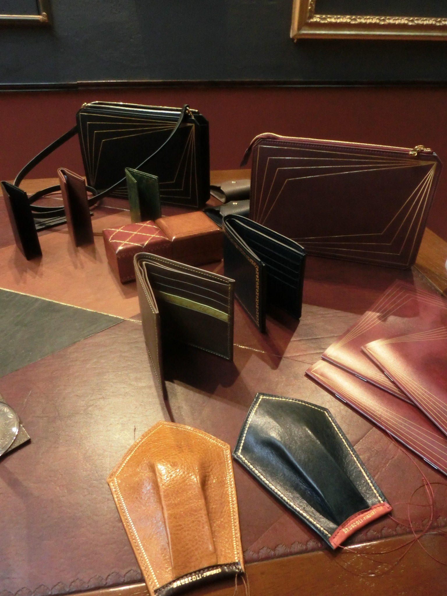 そして現在、斎藤さんは今までのブルスコリの仕事の他に、もともとの彼女の夢であり、先代までは作っていなかったバッグの製作を開始。小さなハンドバッグについているのは、フィレンツェ旧市街のドアに見られる金具で、遊び心が入ってます。そして、今この工房の顔になっているのはこちらの、「フェイクの本棚」シリーズ。