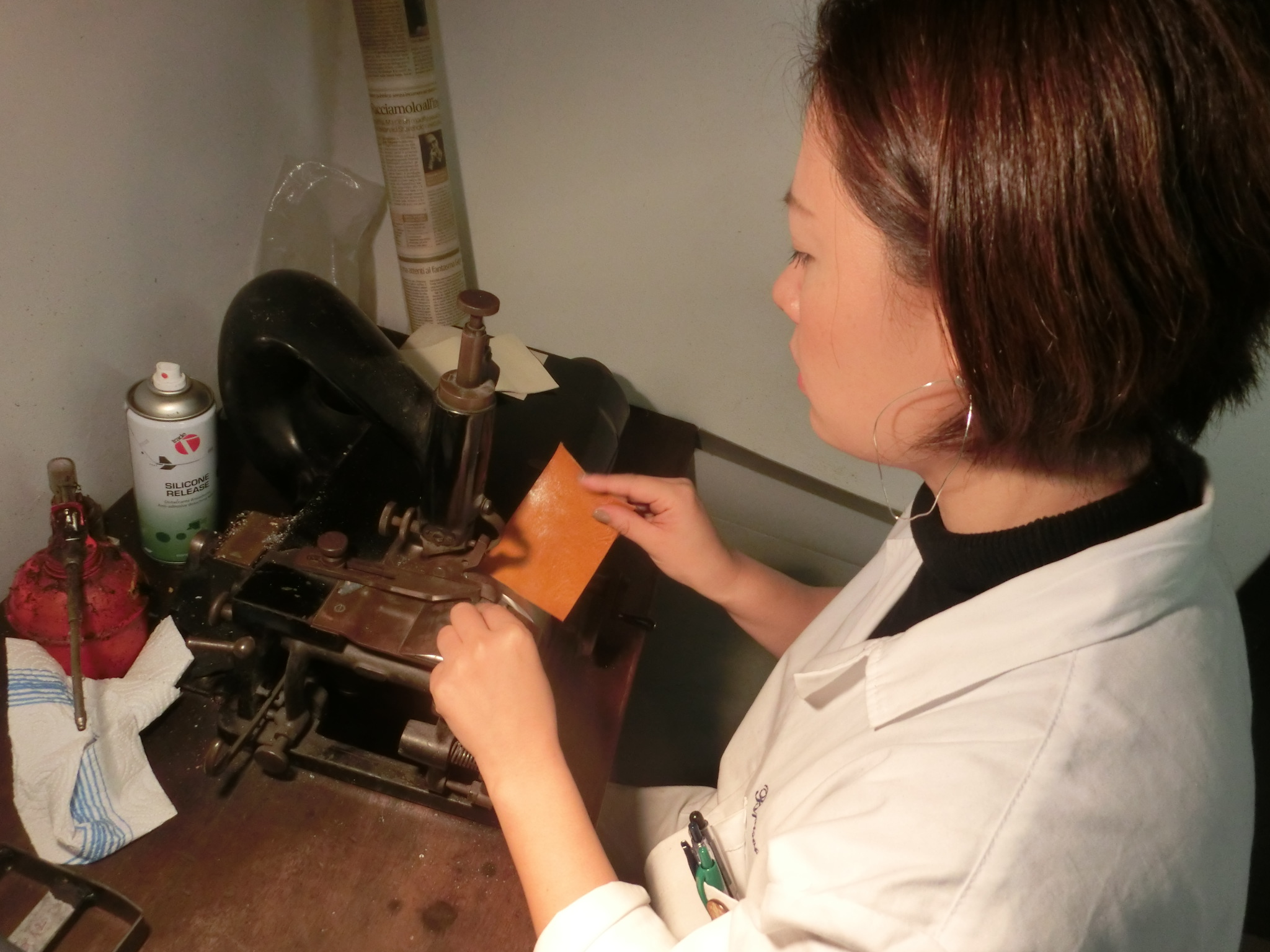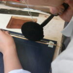 敷いていた金シートにぎゅっと。簡単そうに見えますが、型の温度、かける圧力、時間などが完璧でないと、ちゃんとくっつかなかったり、金が焦げてしまったり。訓練を経て、やっと習得できる技術なのです。