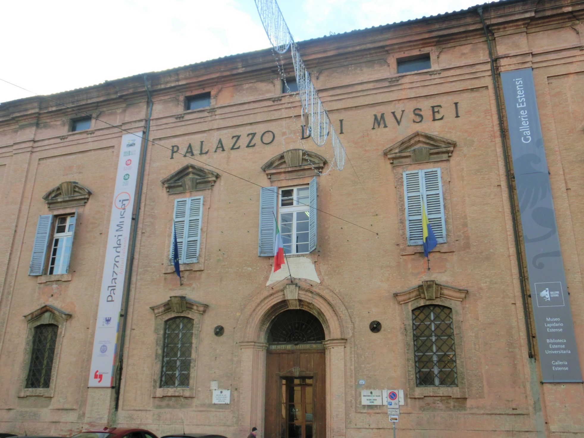 駅は旧市街の北側なのですが(駅から旧市街まで徒歩約12分)なのですが、私たちは車で来たため、駐車した場所から一番違い西から旧市街へ。今回は時間なく見送りましたが、右側にあるのは「Palazzo dei musei」という複数の博物館が入った建物です。中世にこのモデナ、そしてレッジョ・エミリア、フェッラーラを統治していたエステ家のギャラリー、図書館、宝石の書、そして市立博物館が入っています。