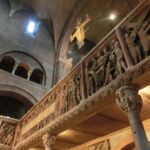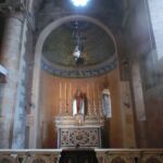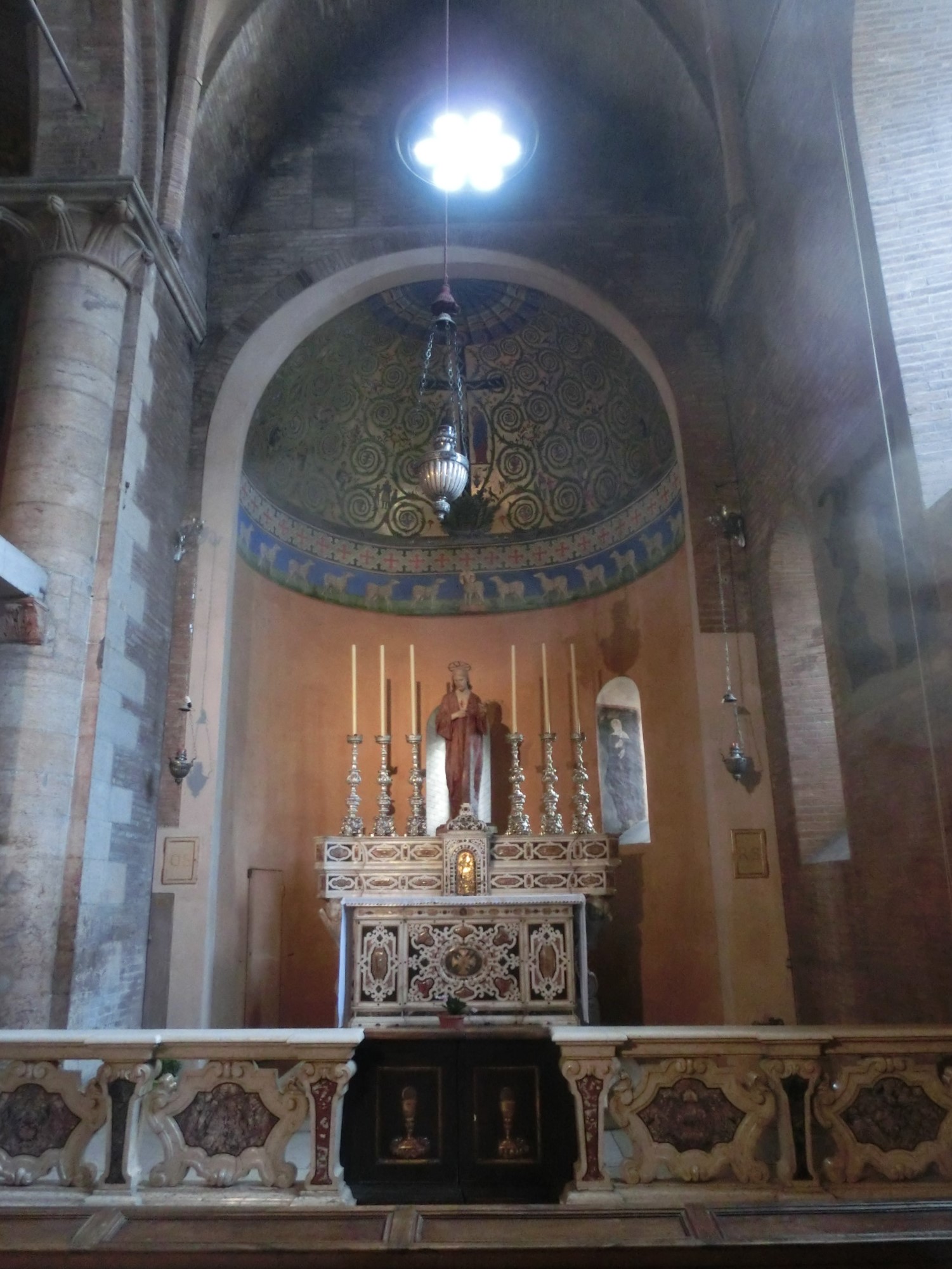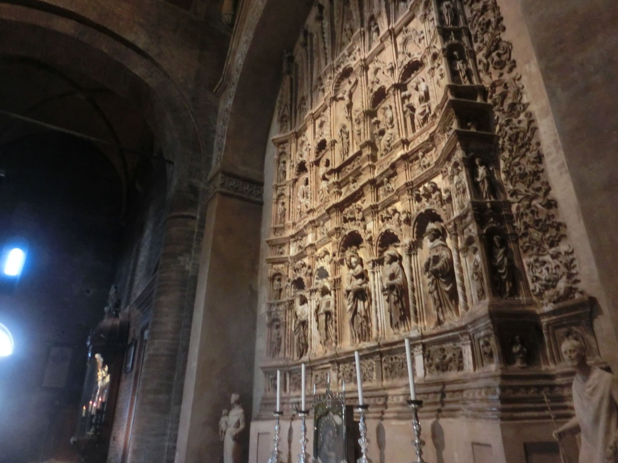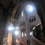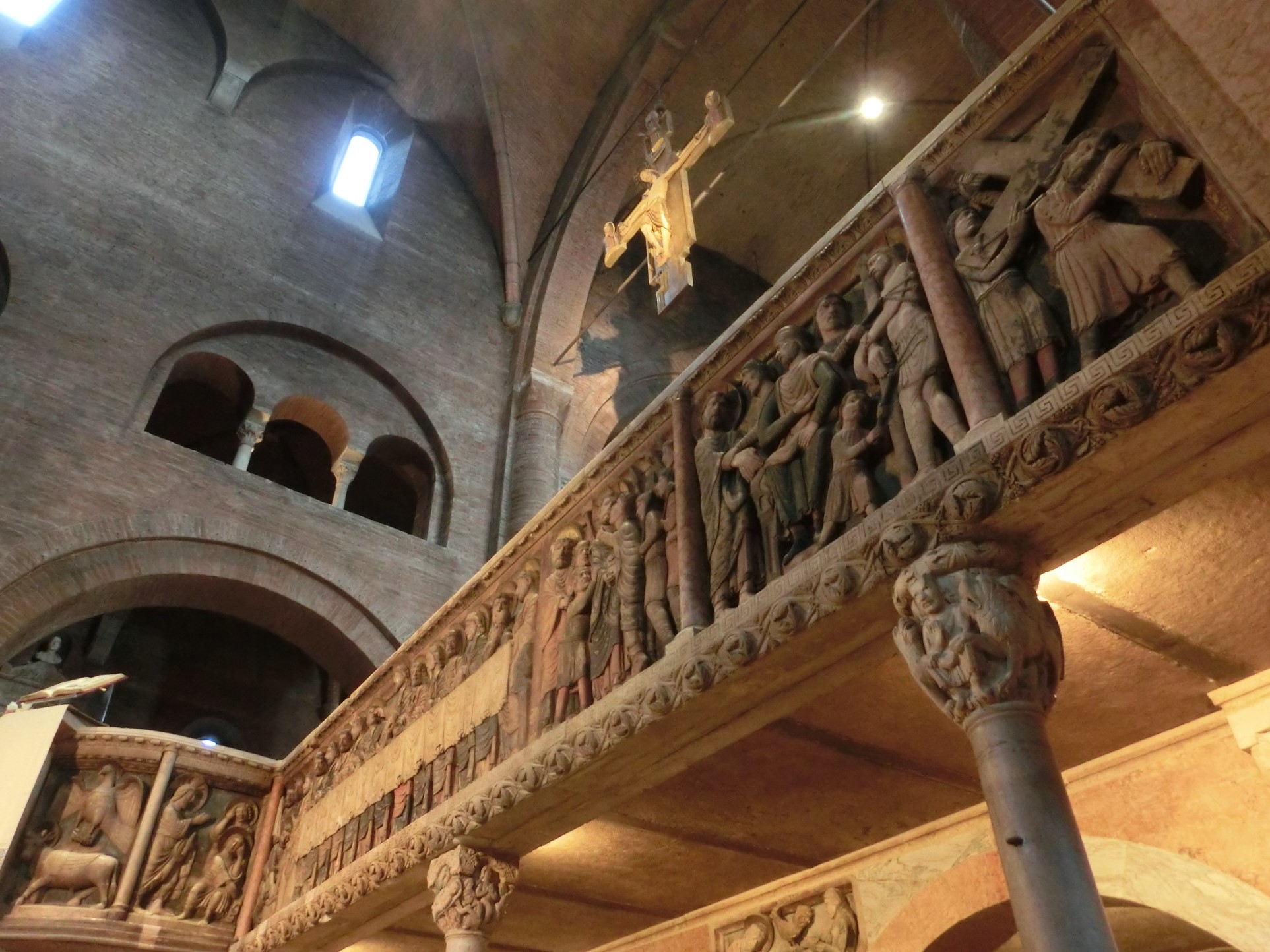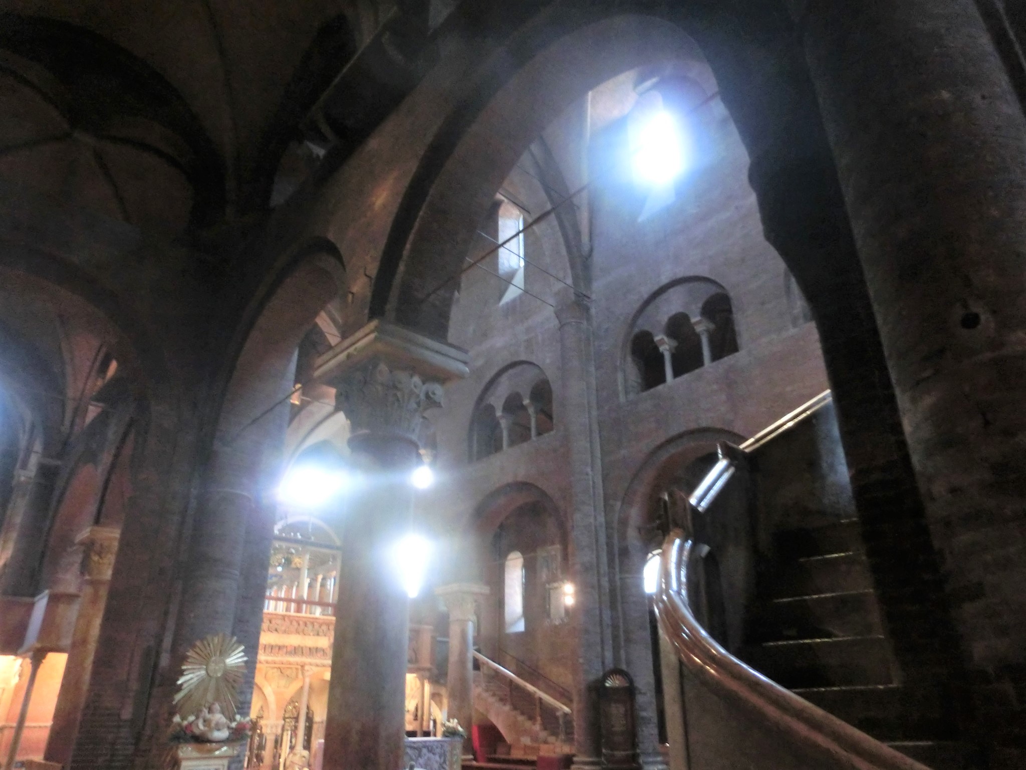 建設は12世紀、3身廊のロンバルディア・ロマネスク様式の教会です。身廊をアーチのある壁で分けてあるだけでなく、同じ身廊内でもアーチがあるごとに壁があるせいなのか、重厚感があります。そして、どこから見てもアーチだらけ!全体的に地味な色調ですが、内陣部分だけはきらびやか・・・