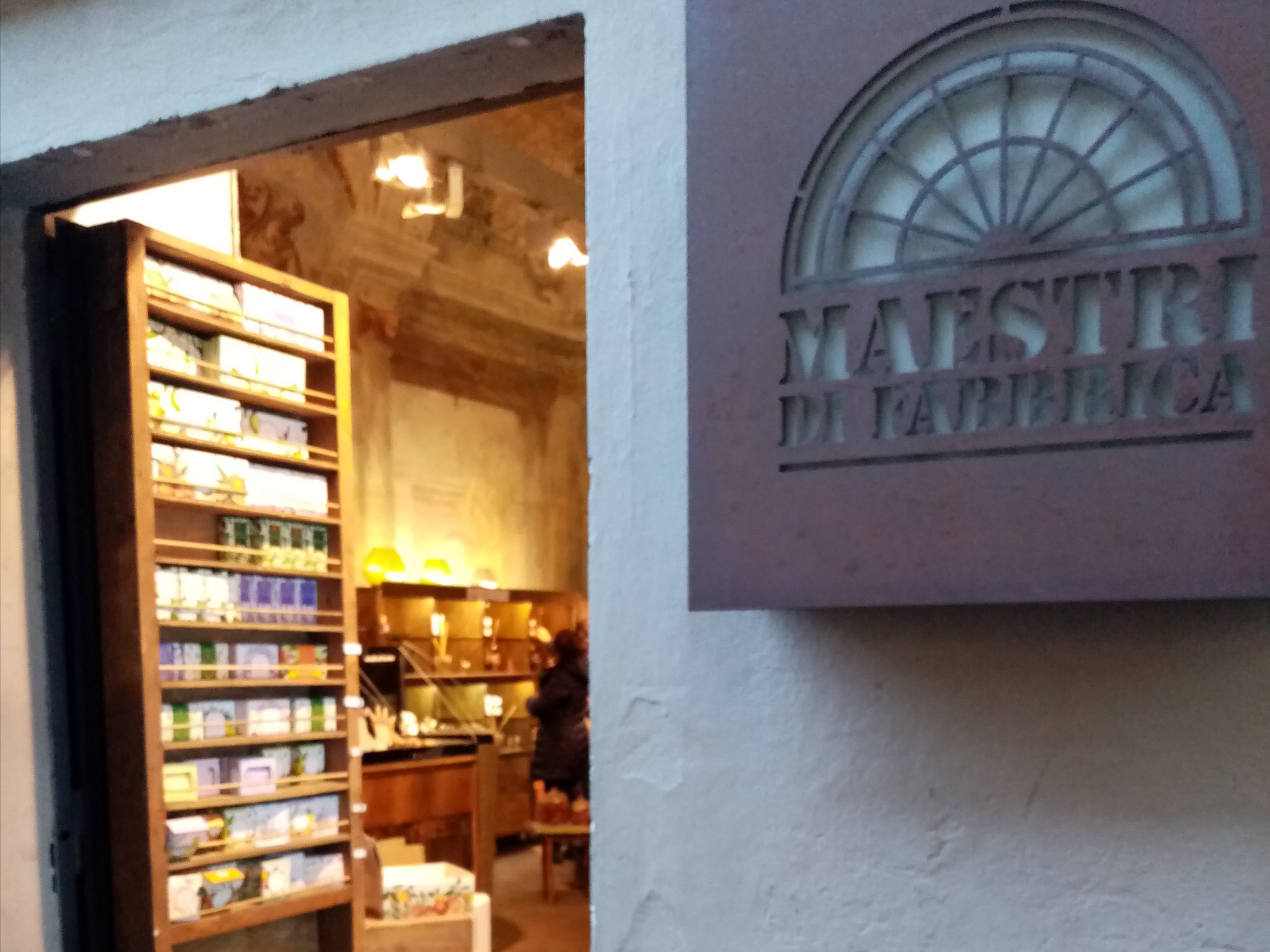 とっても面白いのが、通りの中ほどにある「Maestri di Fabbrica(=工場の匠)」と言うお店。ここはアルビツィ家最後のヴィットーリオが残したもう1つのアルビツィの館、そしてコンサルティング会社の本社があるのですが、元々中小の生産者へのコンサルティングをしていた会社が、それらの会社が一堂にプロモーション・販売できるように作ったのがこのお店という訳。カテゴリーは広く、家庭雑貨からコスメ、バッグなどのファッション小物や飲食関係まで、そして近年には店内にレストランコーナーもオプンし、ランチ&ディナーがブッフェ形式で食べられるほか、テーマの食事会などのイベントもしているそう。店内は撮影禁止なので写真はありませんが、アルビツィの時代の華やかなフレスコ画などもそのまま残っているので、入るだけでも楽しいですよ。