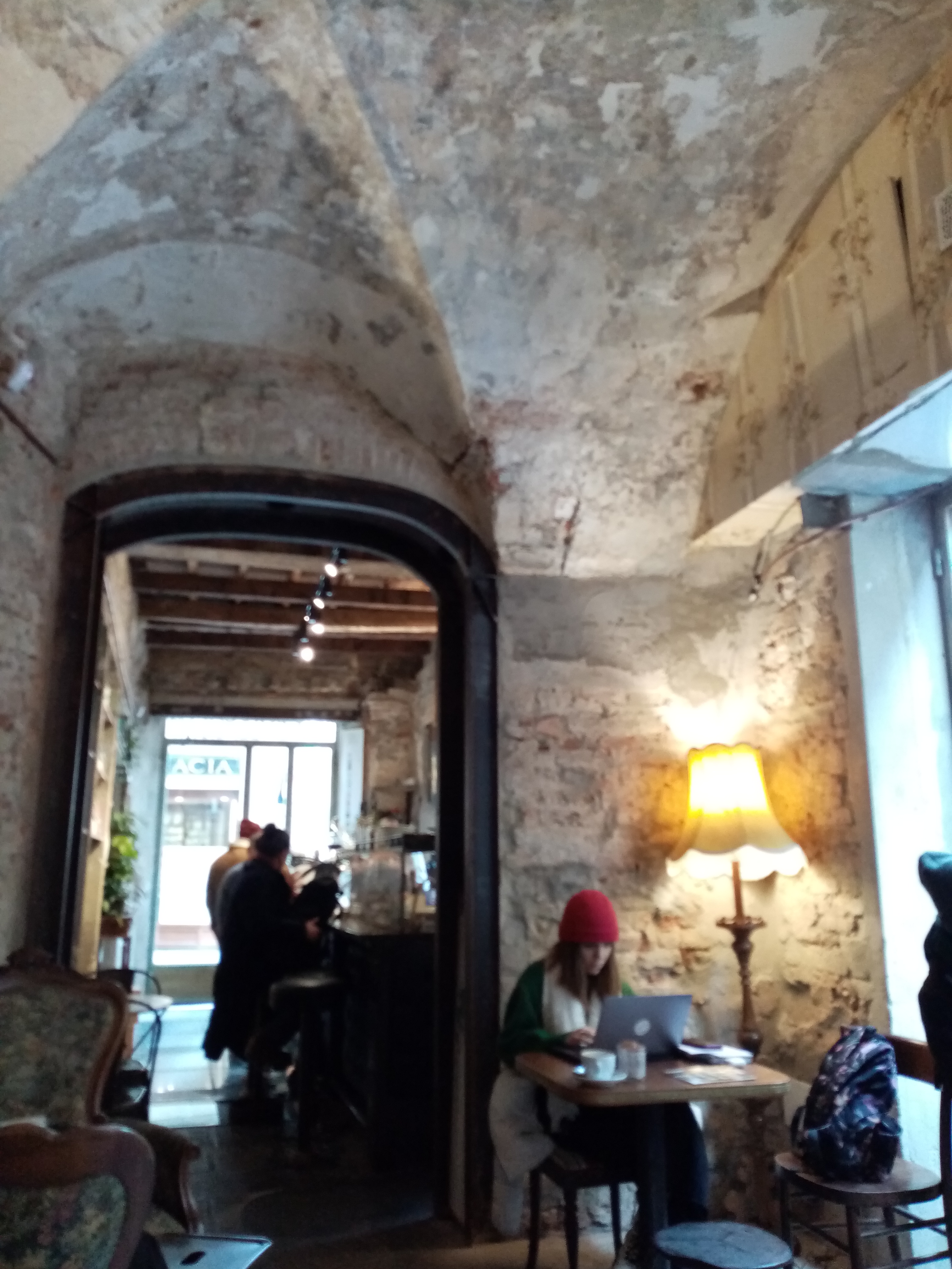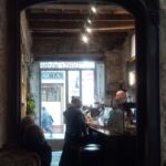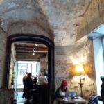 奥の席も追加料金なしで(ただし、カウンターで注文して自分で運びます)、この日の私はオルゾ・マッキアート&お米入りタルトで2.7ユーロ。タルトやクッキーも、夜に食事を提供するシェフが作ったものなので、当然ながらめちゃくちゃ美味しいです。私も通っていたフィレンツェ大学文学部キャンパスの至近のため、学生さんもたくさんいましたよ。ご覧のように中は石造りの落ち着いた空間で、皆のんびりと・・・席数は20席もなく少ないのが残念、いや、このこじんまり感がまた良いのです!