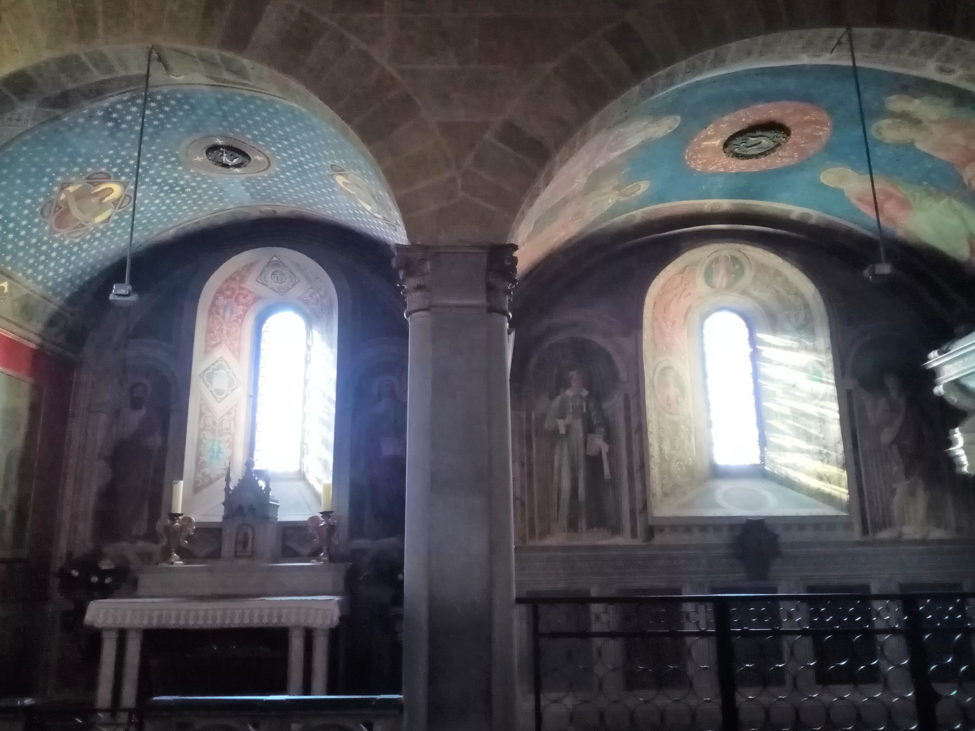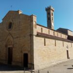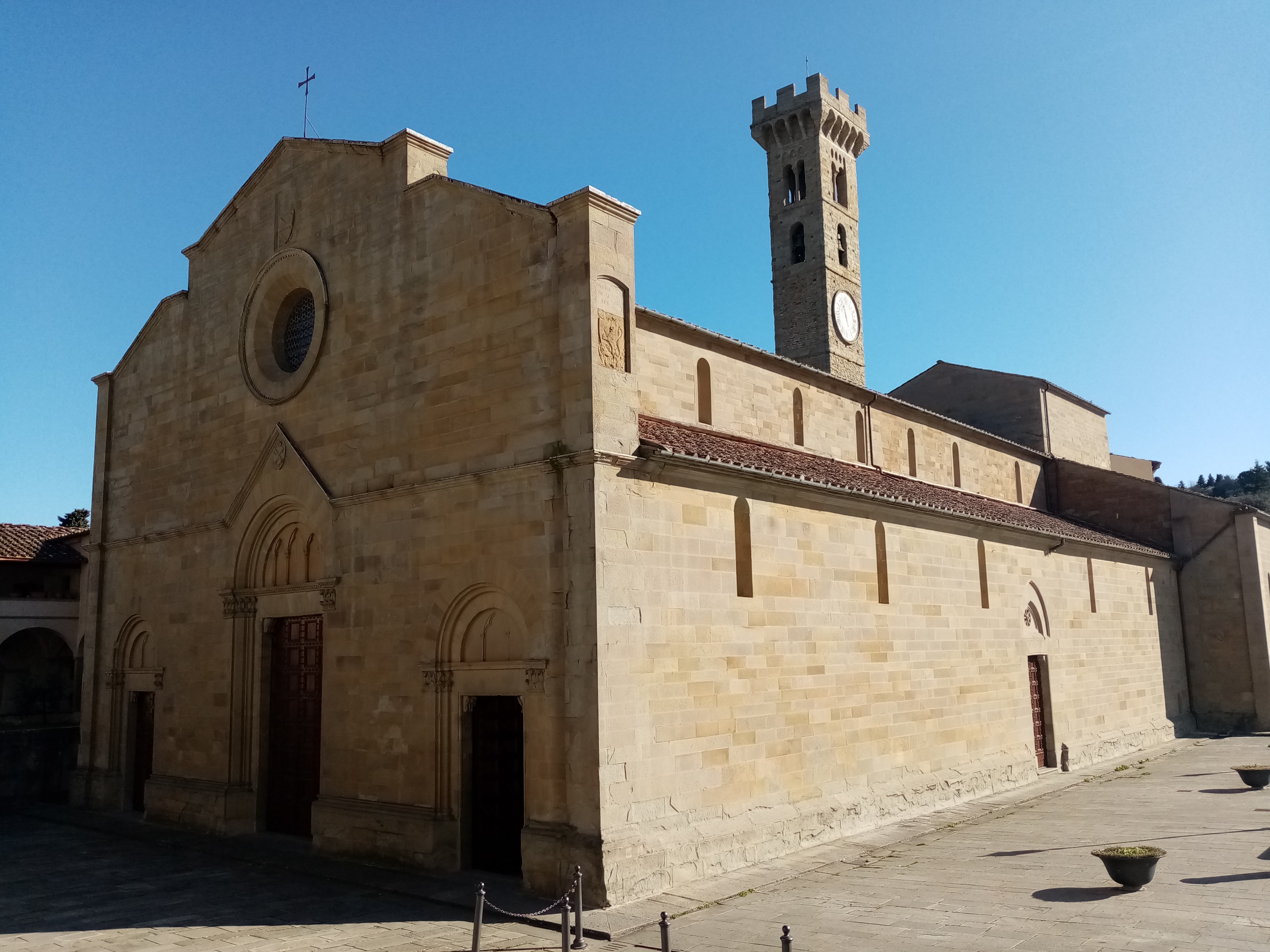 上りではフィレンツェを見下ろすことに集中してしまいますが、今度は下り、坂道の下に見えるフィエーゾレの町もとっても素敵。ひときわ目立つのがミーノ広場にあるドゥオモの鐘楼です。坂を下りきったら、そのままドゥオモに入ってみましょう。ドゥオモの正式名称は「聖ローモロ大聖堂」で、フィレーゾレの大司教座であり、元々のフィエーゾレにあった修道院を移設する形で1026年に建設されました。大聖堂はそのあと13世紀には鐘楼が、そして13世紀の拡張工事、19世紀には現在の形のファザートが完成し、今に至ります。ロマネスク様式で内部は質素ですが、主祭壇のある半ドーム天井のフレスコ画(聖ローモロの生涯)、向かって右にあるサルターティ礼拝堂(1466年に亡くなったフィエーゾレ大司教のレオナルド・サルターティのお墓)のフレスコ画がとても立派です。