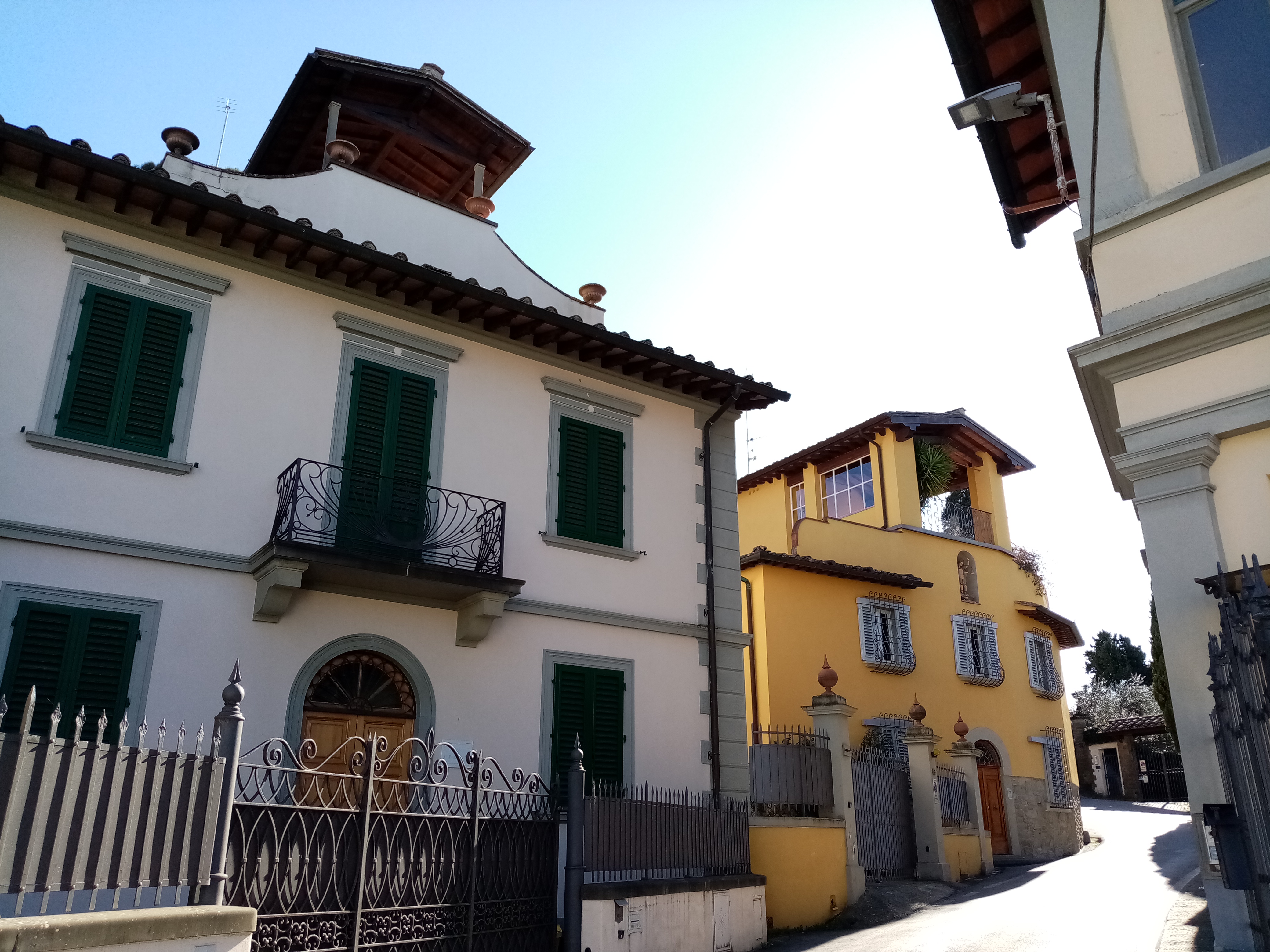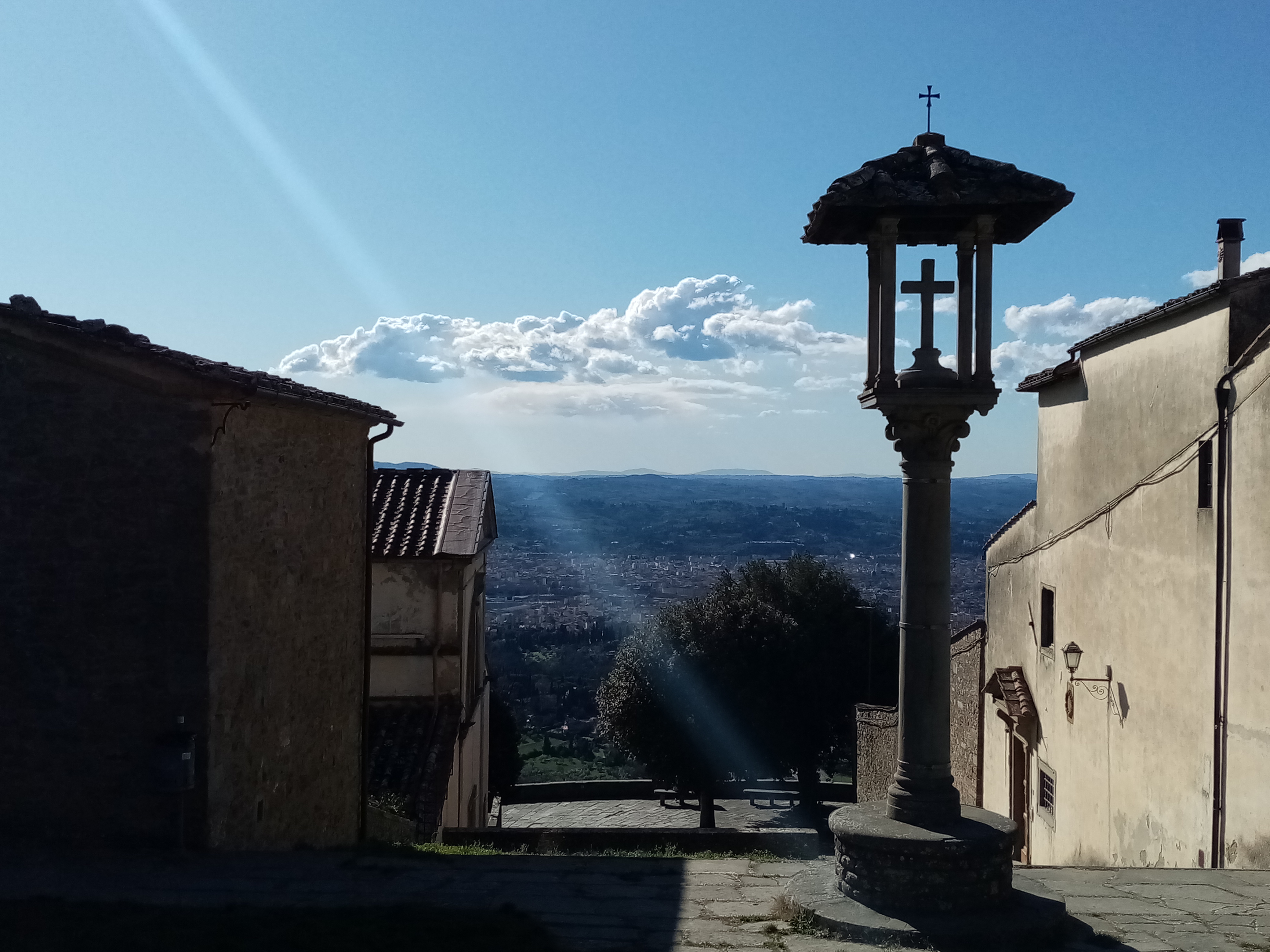 坂を上り始めて振り返ってみた、ミーノ広場。左の大きな教会がフィエーゾレのドゥオモ、奥の建物が市役所になります。坂の入り口はゆるやかですが、そこを左折すると結構急な長い坂になり、えええ!?と一瞬上るのを躊躇してしまうかも・・・それでも、ここを上れば待っている美しいパノラマを楽しみに、運動がてら上ってくださいね。