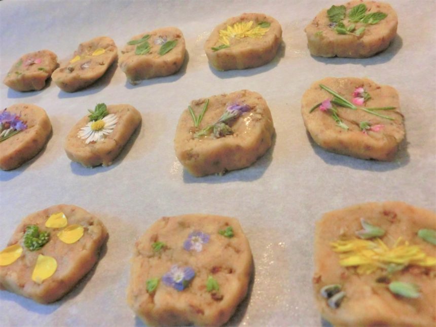 そして焼き上がりは・・・こんな私でもこんな可愛いハーブクッキーができました💛・・・我が家は白いお砂糖はないので、ちょっと茶色いのはご愛敬!でも先生曰く、そのぶん白い花は映えるね!って。確かに~。あとはうちのオーブンは結構パワーあるので、温度を少し落としても良いかな。作ってる途中でもそう思い、上段に上げる時は125度までおとしたのだけど、それでもすこしやきすぎな感じ。