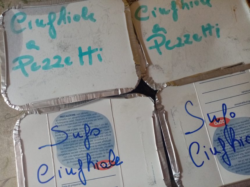 TOP写真のように4つの容器、半分はスーゴ=ミートソース、半分はペッツェッティ=ゴロゴロ煮込み。冷凍バッグに入ってたおかげでほんとんど解凍してなかったので、スーゴは冷凍、煮込みはそのまま解凍してその日の夕食になりました💛