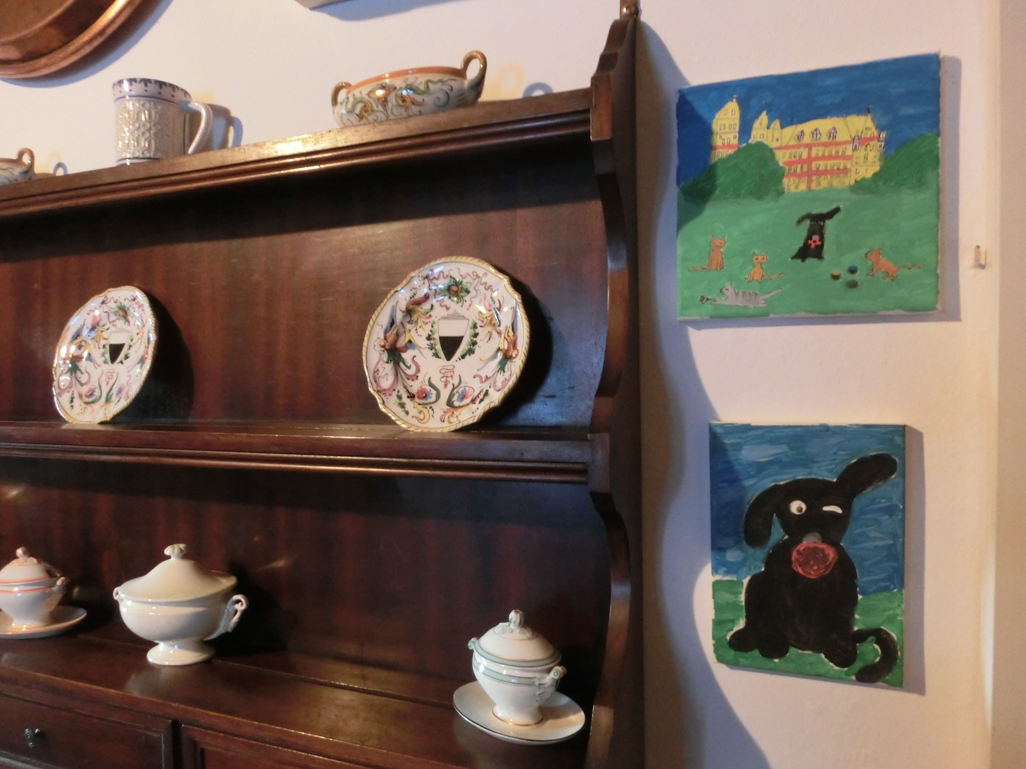 宿泊場所は、城の一角であり、前所有者の女性が2011年まで生活していたところ。入るとすぐにダイニングキッチン、そして写真のリビング、その奥に寝室とバストイレと、1LDK のアパートになっています。ダイニングキッチンの床や天井は1200年代の建設当時のもの、他の部屋も1800年代のオリジナルです。家具や調度品については、城内にある他の30ちかい部屋からピックアップし、修繕して配置しなおしたもの。宿泊施設にするために購入したものは一切なく、あくまでこの城のアイデンティティをそのままに残しています。