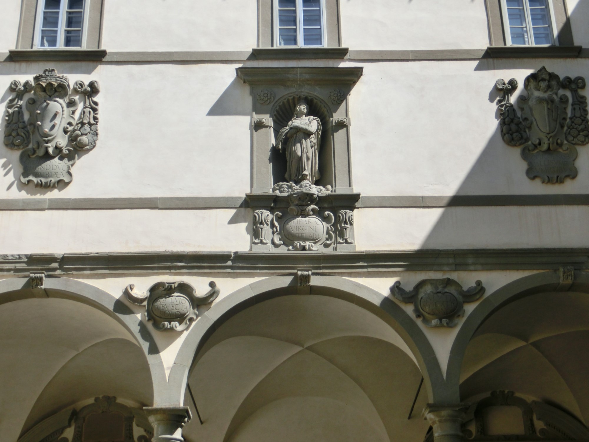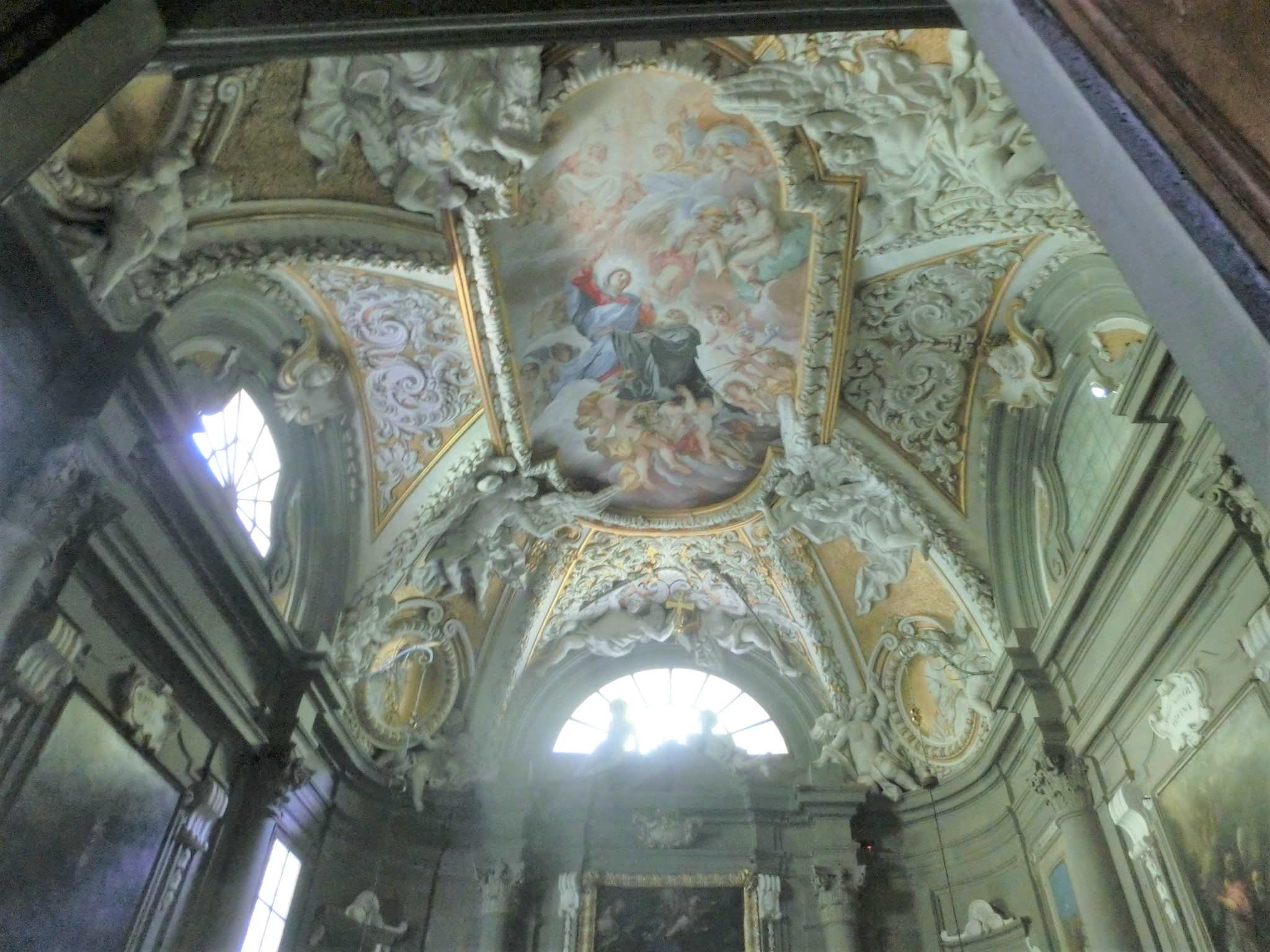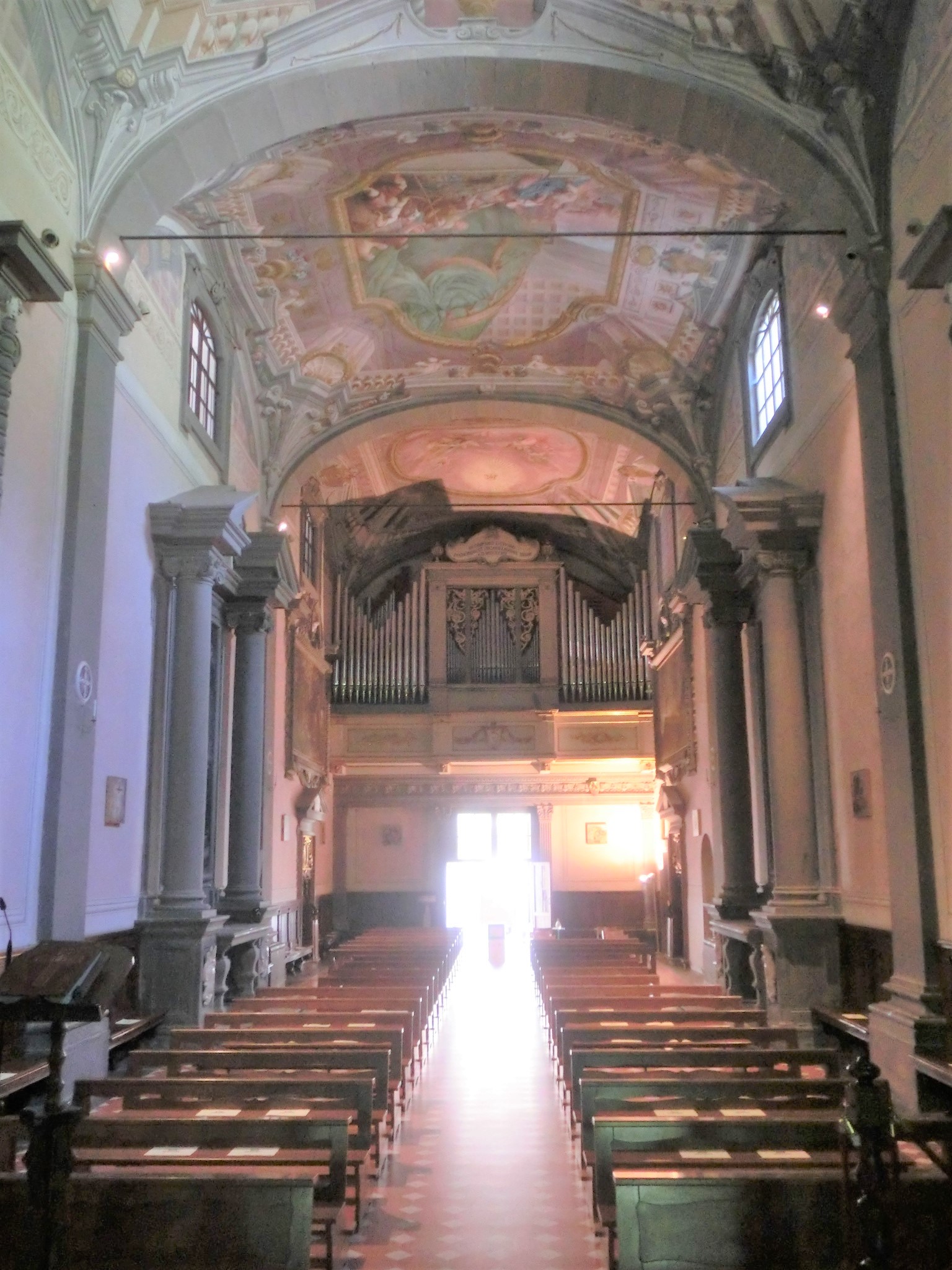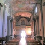 内部は美しい幾何学模様の大理石、天井画は1700年頃の作品。その他、聖具室にはアンドレア・デッラ・ロッビアの色彩テラコッタなどがありますが、ヴァッロンブローザ祭壇画などはフィレンツェのウフィッツィ美術館やアカデミア美術館に所蔵されています。主祭壇手前の翼廊は礼拝堂があり、特に向かって左側のサンジョヴァンニ・グアルベルト礼拝堂とサン・サクラメント礼拝堂(写真下)は必見です。