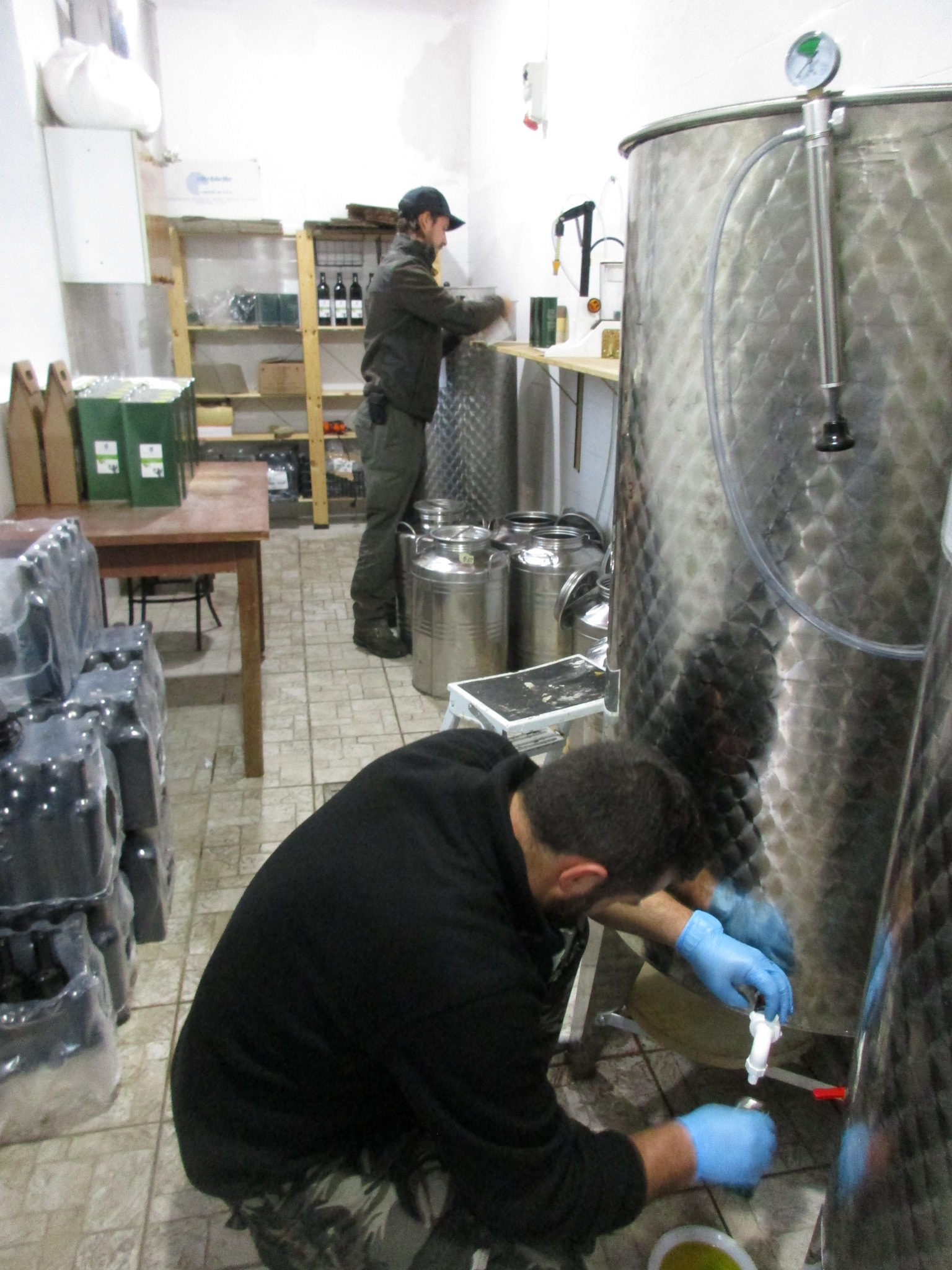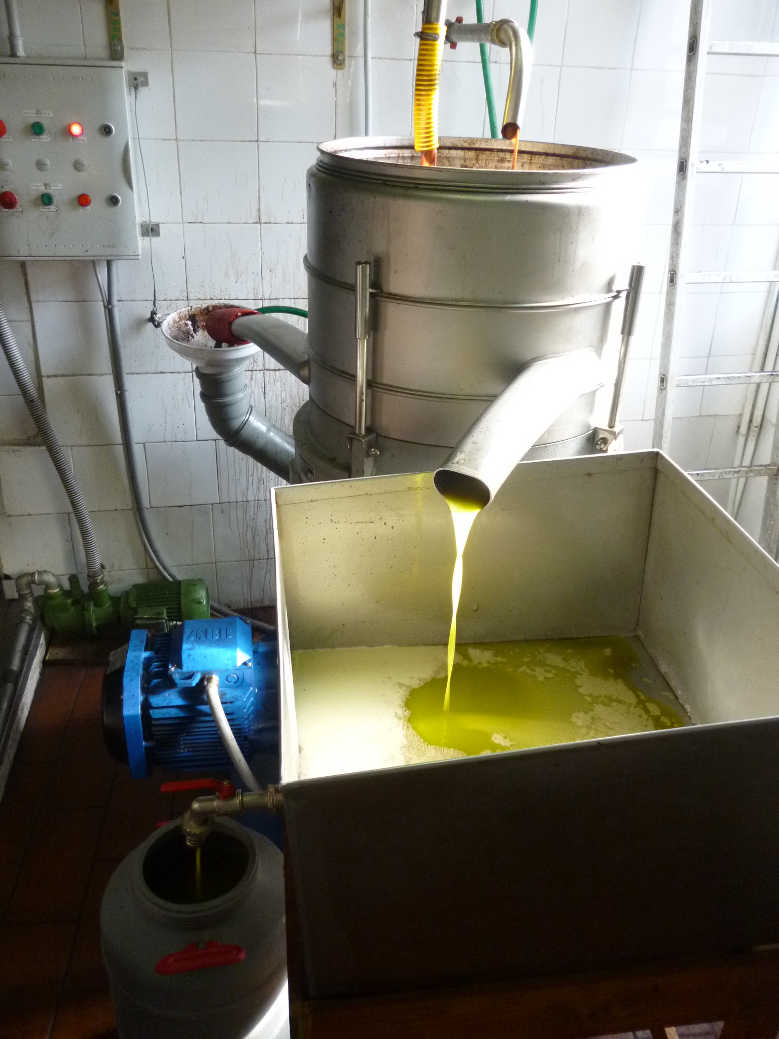 円柱の機械から搾り出された実汁はまだ赤茶色のに、オリーブオイルとして分けられたものの 緑の鮮やかなこと!! 流れ出てくるところに直接パンを出してつけて食べたかったくらいです。最後は、おそらくオリーブの実を納品した人の個人のタンク(半透明のプラスチック容器だったり、ステンレスの牛乳を入れるような容器だったり様々)に流れていきます。