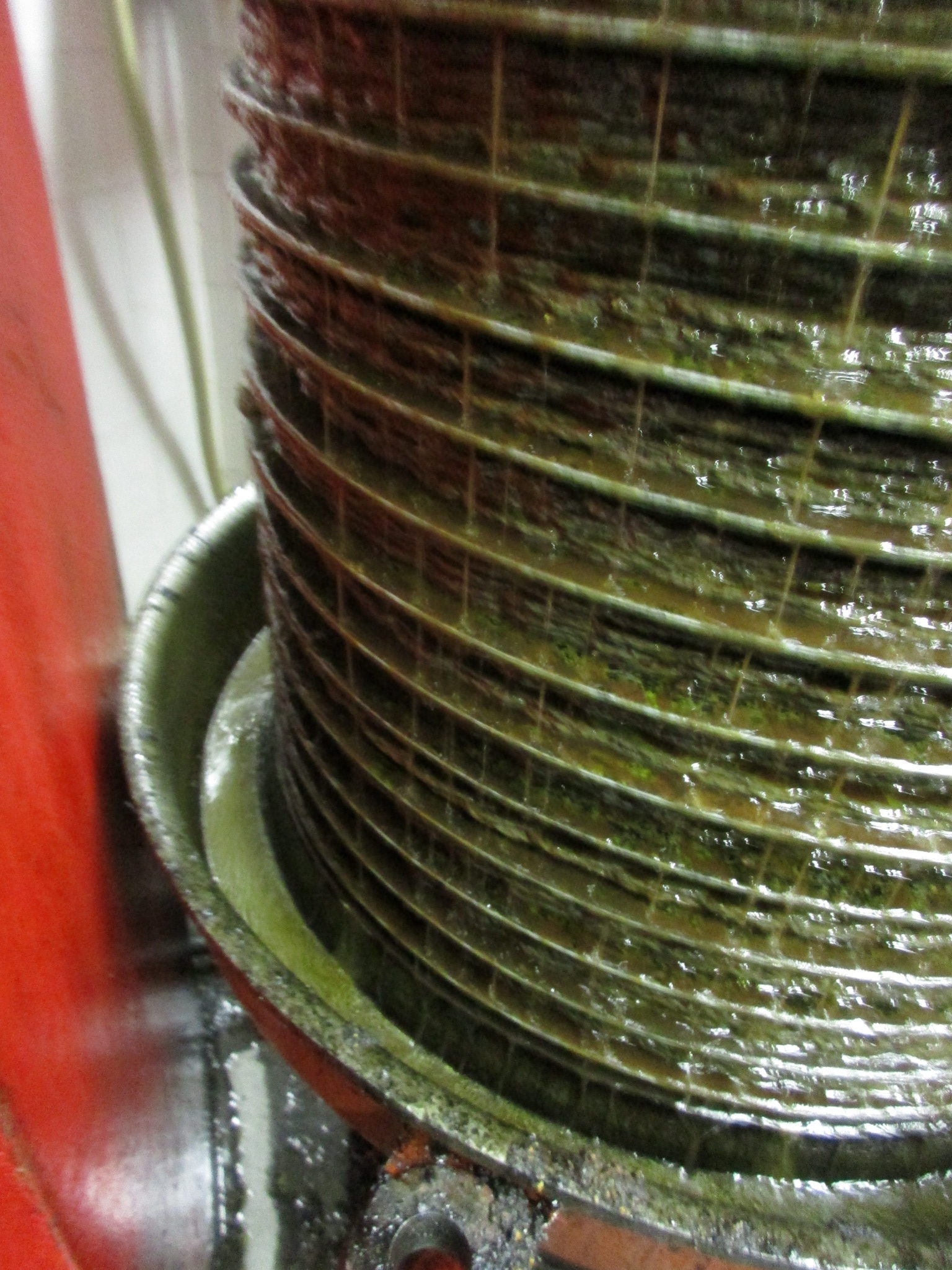 石でつぶされたオリーブペーストは、作業員によってディスクに塗って積み上げられていきます。そのディスクの重なった円柱を機械に入れ、圧縮するとペーストの部分からじゅ~っと実汁が! それはどこに流れていくのかというと、真ん中の部屋。狭い搾油所ですが、部屋の高低差を利用してうまくつくられています。実汁をうけるタンクからこ遠心分離機にかけられ、水分と油分に分けられます。