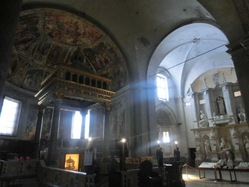 質素、と書きましたが、ご覧のように大理石造りの立派な教会。他のローマの教会が豪華すぎて、こんな感じが質素に見えてしまいますね(笑)。お目当てのユリウス2世の霊廟は、3身廊の右側奥にあります。