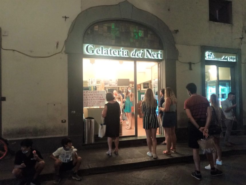 フィレンツェはほとんどの場所が徒歩圏内で観光できるものの、端から端まで歩くと結構な距離。なので、食事にしてもバールにしても、そしてジェラートにしても、エリアごとにお気に入りを見つけておくと便利です。今回ご紹介するジェラテリアは、「ディ・ネーリ」。その名の通り、ディ・ネーリ通りにあるジェラート屋さんです。ゾーンとしては、シニョーリア広場&ウフィッツィ美術館裏~サンタクローチェ広場で、このお店はネーリ通りの東の端近く、サンタクローチェ広場側にあります。TOP写真の通り、コロナ禍の影響で店内には2組しか入れないこともありますが、その前からいつも賑わっている人気店の1つです。