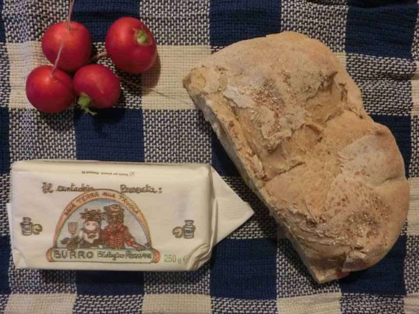 イタリアはオリーブが栽培できない北部以外は料理にバターはほとんど使わないので、まずは美味しいバター買わないとな、と思っていたのですが、ちょうどよくパルミジャーノ・レッジャーノ工房で自社のバターも売っていたのでそちらを購入。ラディッシュは畑のを使いたかったのだけど、栽培に失敗し、残念ながら市販品ですが、パンはもちろん自家製。塩は精製なしの天然塩。
