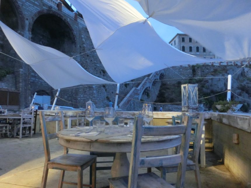 ピオンビーノでの食事は私の誕生日でもあったため、ロケーション重視で海沿い、ボーヴィオ広場周辺を検索しました。ランチがレストランなら夜は軽くここで、ランチがパニーノならレストランへ・・・と決めていたのですが、結局ランチがパニーノになったので、このレストランを予約!店名「海の劇場」と呼ぶにふさわしく、ボーヴィオ広場脇を下り、海の真横にあるテラスがメインホールです。ここは5月~9月までの夏限定営業ですが、朝から深夜2時まで開いており、バール、食事、飲みと幅広く使えるうえ、ライブなどのイベントも。そして、レストランの下にはビーチまで経営しているので、手軽に海を楽しみたい方にもおススメですよ。