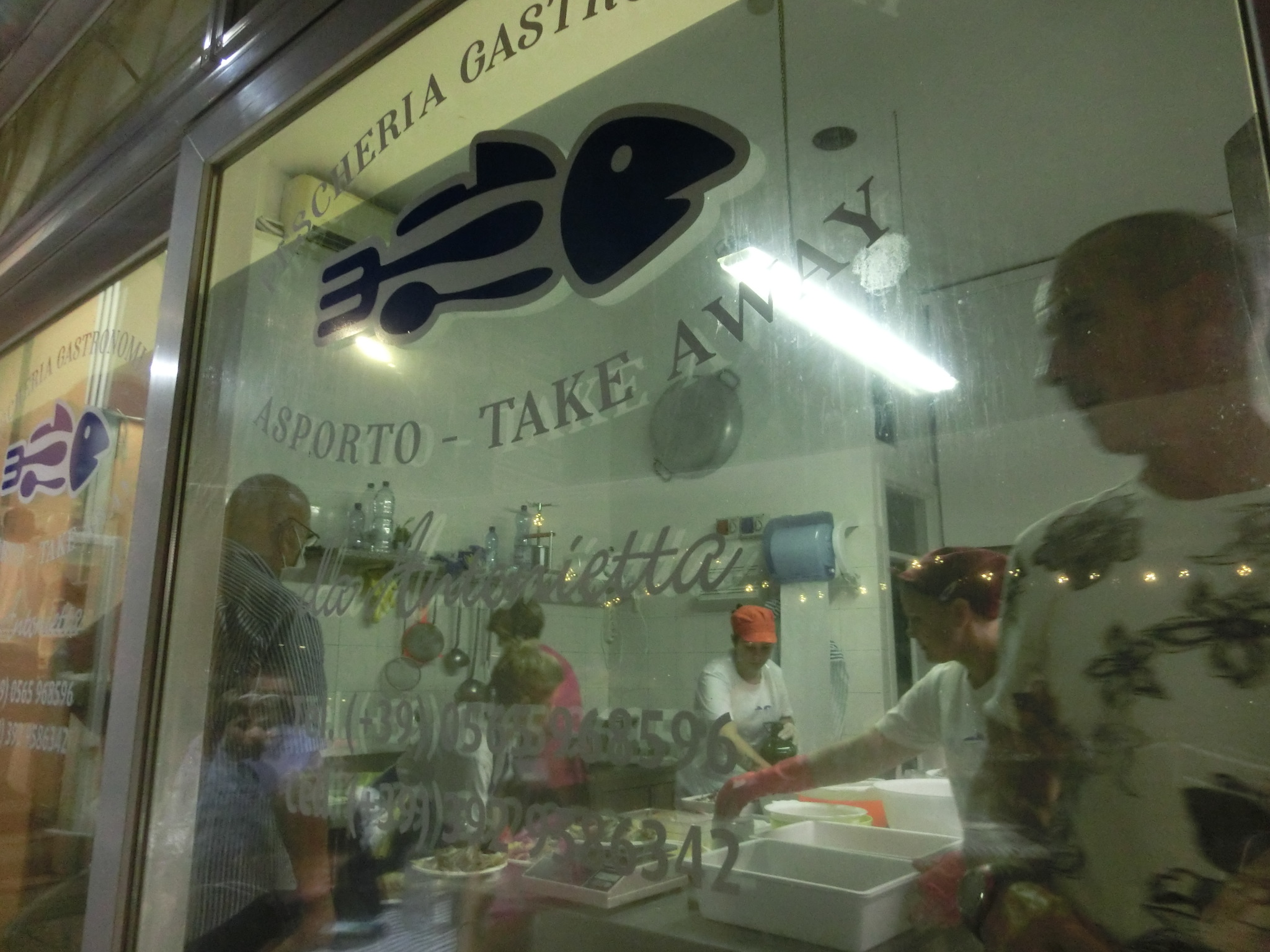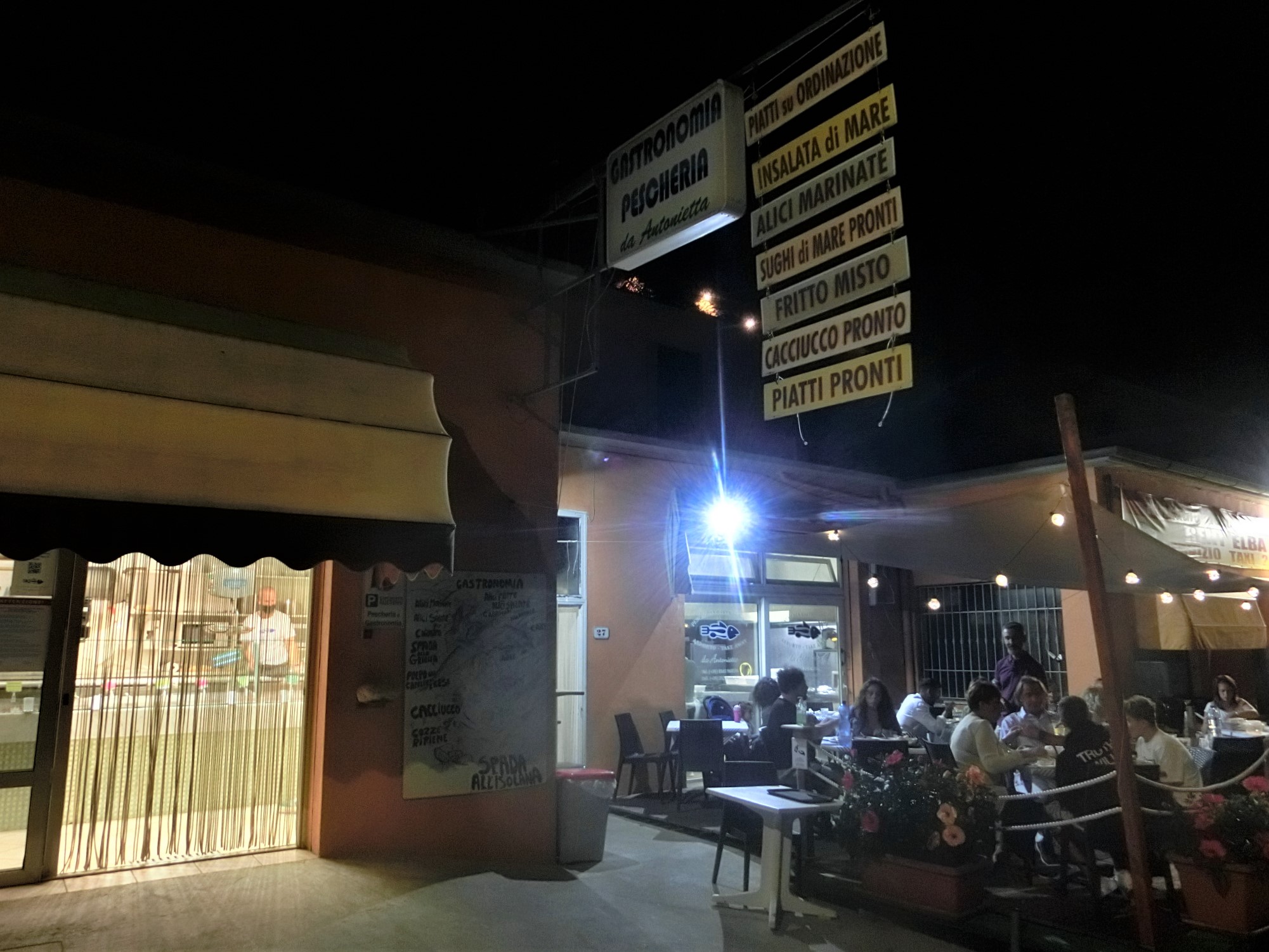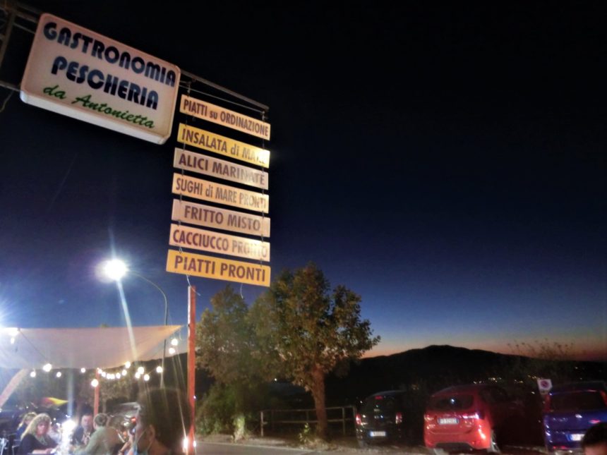 同じトスカーナ州と言えど、山のおらが村から島バカンスに来たからには、海の幸を堪能しなければなりません。自炊メインでわずかな外食機会にミスは許されず?ということでリサーチした結果・・・今回のバカンスで大いに役立ったエルバ島情報FBコミュニティで紹介されていたココ、毎年エルバ島に行っているママ友も太鼓判だったので、最後の夜に行くことにしました。うちは基本、シックで高価なレストランよりも、食堂系のレストランが好み。ここは魚屋さん(しかも漁師の親戚からの仕入れ)が直営するテイクアウト&半分セルフサービスのようなお店=お店の肩書も、「魚屋・総菜屋」。コロナの影響もあるので事前に電話してみましたが、やはり予約はできずに「大丈夫、席はあるから」と言うので張り切ってGO!