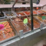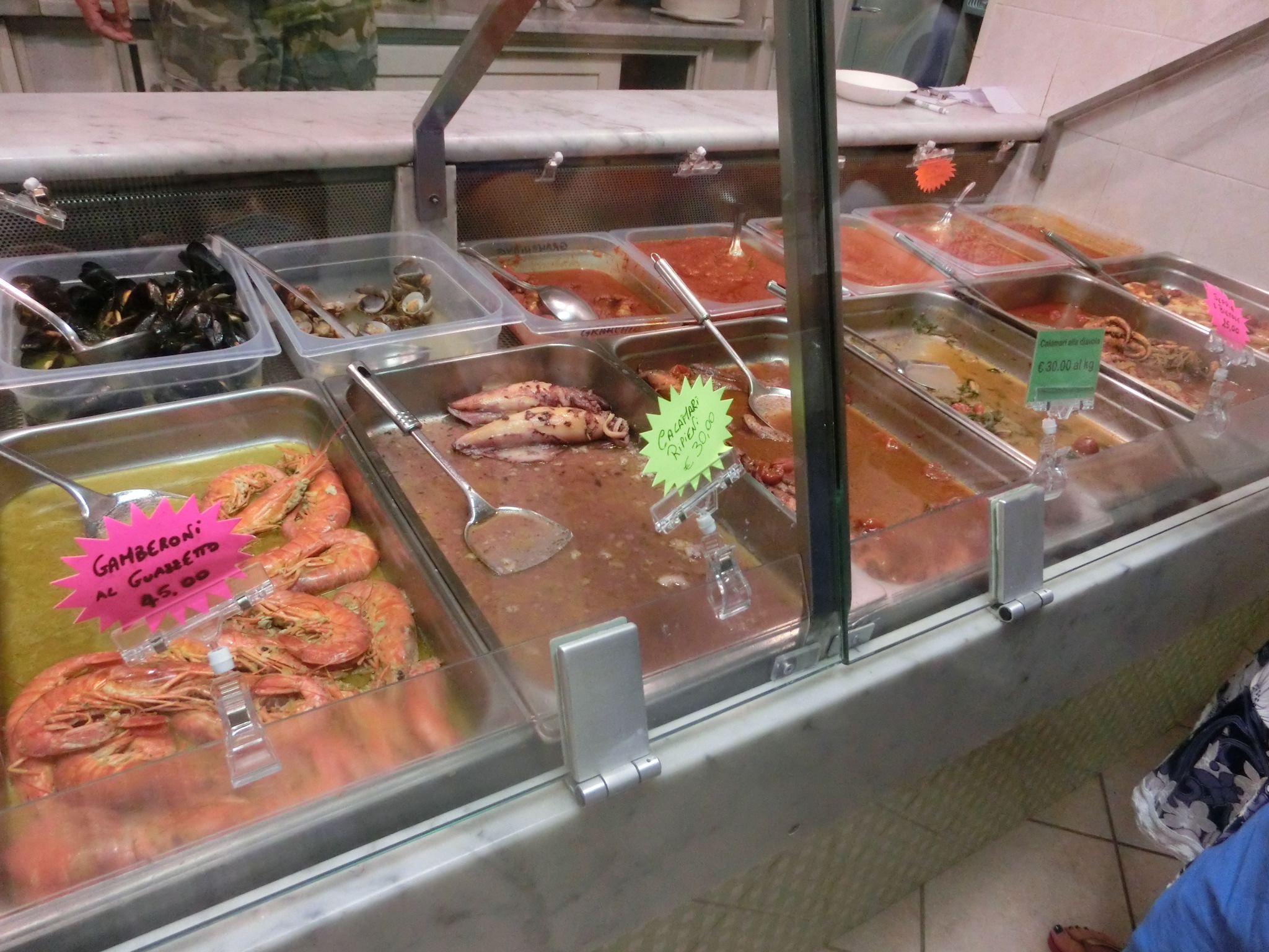 た、食べたいものが多すぎる・・・目移りしまくりです。パスタやリゾットもあるけれど、多いのは前菜・メインでしょうか。すでに出来上がってるものはここから温めるのですが、ミックスフライはカッチュッコ(魚スープ)は奥のキッチンにオーダーを入れていました。少なくともミックスフライは、オーダーが入ってから揚げてくれるので・・・