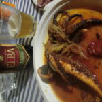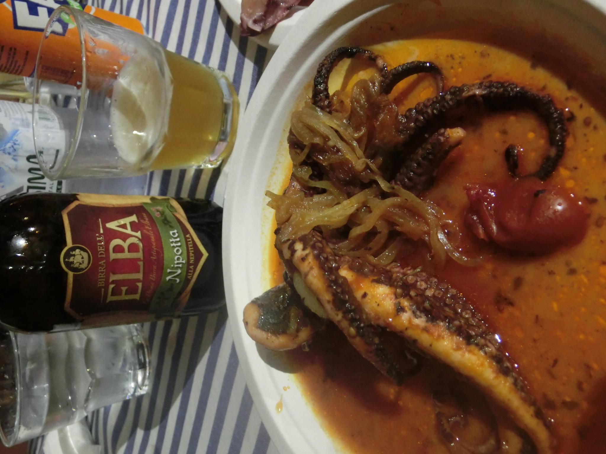 タコの玉ねぎ&トマトの煮込み、イカの詰め物。魚より、イカタコエビが好きな私らしいセレクト。中にモルタデッラやパンが入ったイカも初めてですが、このタコが絶品で!タコと玉ねぎ、めちゃ合うことを初めて知りました。このタコのメニュー名は「ルチャーナ風」だったので、コックさん?それともオーナー奥さん?が分かりませんが、ルチャーナという名前の女性が考案されたのでしょうね。こうしてミックスフライ×2、カッチュッコ、タコ、イカ、ポテトフライ×2、水、エルバ島のクラフトビール1本で、55ユーロ。おそらくレストランで同じものを食べたら倍近くになるでしょうね。
