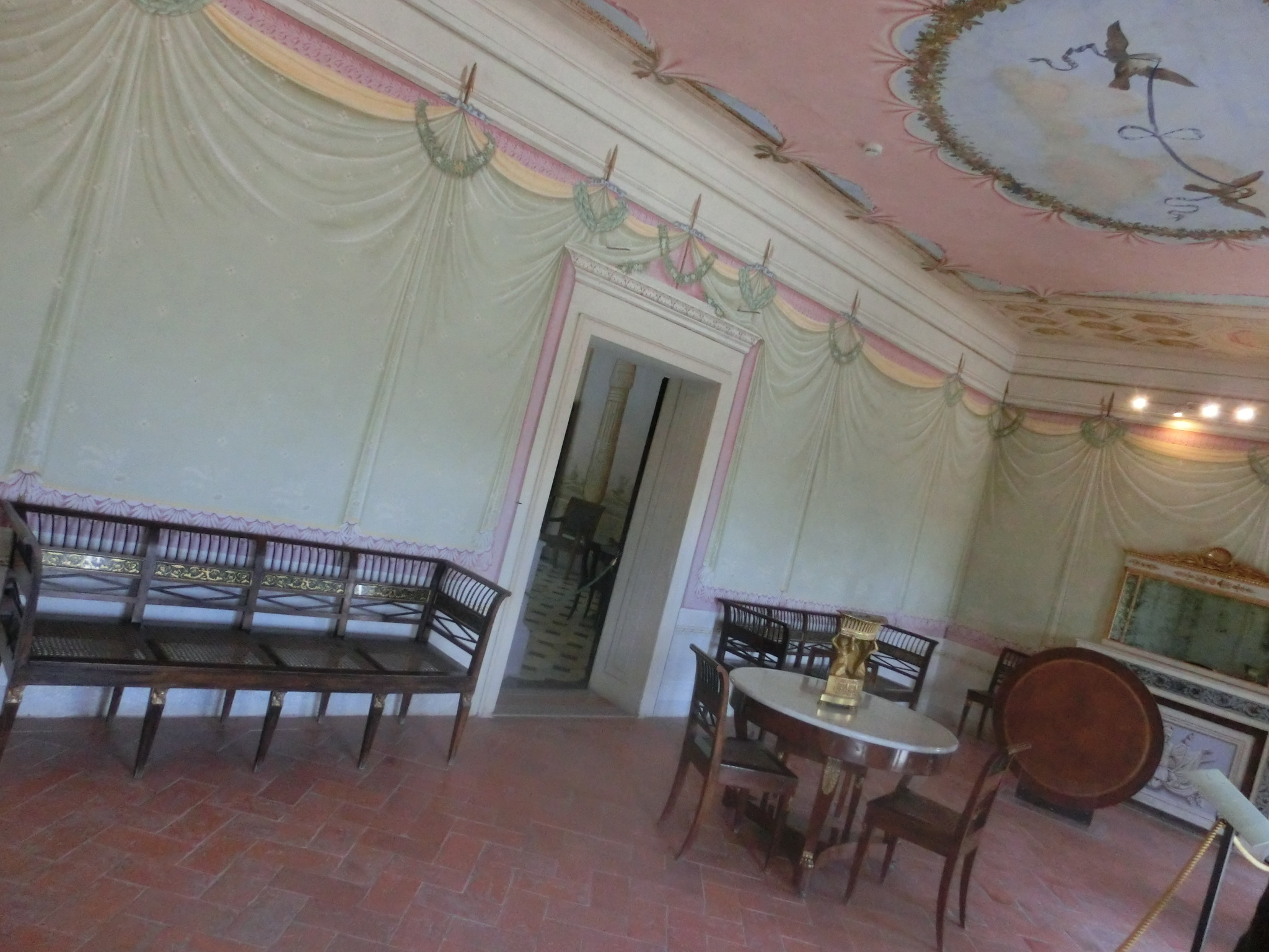 「エルバ島」と聞くと、「ナポレオン」を連想する方は多いと思います。とはいえ、ナポレオンがエルバ島に滞在したのはたったの299日=約10か月。1813年のライプツィヒの戦いに敗れ、翌年に3月末にはパリ陥落、4月にはフランスで王政が復活し、ナポレオンはエルバ島へ向かうことになった・・・のですが、ちょうど私たちがヴィッラ・サン・マルティーノに行った時に別料金でついてもらったガイドさんの話によると、ナポレオンの行き先候補は他にも2つ、コルシカ島(フランス)、コルフー島(ギリシャ)があり、ナポレオンはエルバ島を加えたこの3島から、エルバ島を選んだのです。近い将来の復活を考えた場合コルフは遠すぎる、コルシカは敵が多すぎる、一方エルバはフランスからも近く敵もいなさそう、という消去法だったそう。もちろんフランスから比べるとタダの小さい地中海の島ですが、ナポレオンはこの島の所有者=王として、この島に乗り込んだのです。