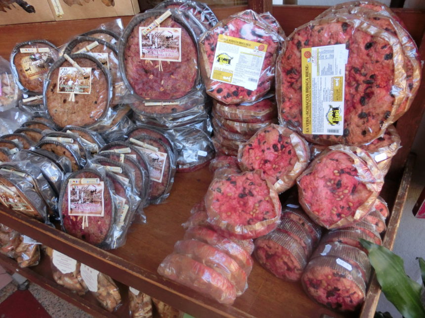 リヴォルノ県でもあるエルバ島では、「エルバだけの」料理がなかなか見つけられなかったのですが、お菓子でそれが存在しました!ポルトフェッライオの店先で、行ったスーパーの特産品売り場で、あちらこちらで見かけたこの赤いもの=Schiacciata Briaca スキアッチャータ・ブリアーカ。エルバ島で一番有名な郷土菓子です。「スキアッチャータ」という名前の食べものは、塩味のパン・いわゆるフォカッチャを指すスキアッチャータ、カーニバル・父の日のお菓子スキアッチャータ・アッラ・フィオレンティーナ、9月のお楽しみ・ぶどうのスキアッチャータなど、トスカーナではよく聞くもので、指で押して(スキアッチャーレ=押す、の過去分詞)作ったり、麺棒で伸ばしたりして薄く作ったものを指します。こちらブリアーカも、その形から来ているのでしょうね。