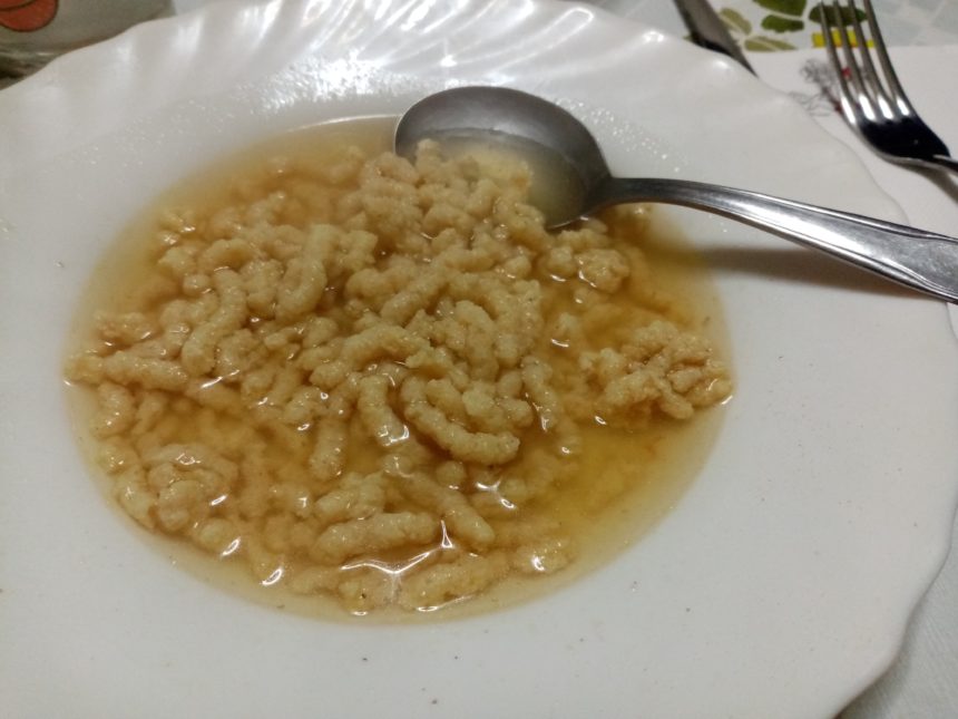 ブロードとは、野菜や肉で取った出汁のこと。クリスマスの定番料理「トルテッリーニ・イン・ブロード」は、去勢した雄鶏と野菜で丁寧に作るので、これはほんっとに美味しい!とはいえ、日常的にはなかなか時間もないので、我が家ではボッリートで出た出汁に、パスタを入れて翌日の晩ごはんとして利用しています。もっと時間がなく、軽く晩ごはんを済ませたいときは、キューブコンソメを溶かすだけでもOK!ちなみにTOP写真は、先日マンマ宅で食べたパッサテッリ。エミリア・ロマーニャの郷土料理ですが、ボローニャ県出身のマンマの姑(つまりダンナの父方の祖母)から習ったそう。私も器具を1つ受け継いだので、この冬こそはマンマから習いたいと思っています。