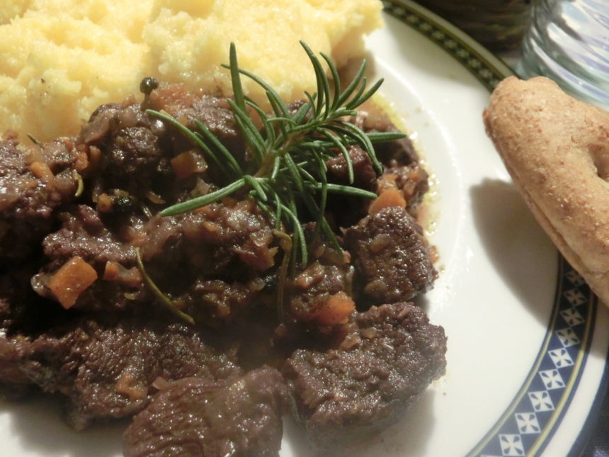 昔ながらのレシピで作るなら、牛肉・赤ワイン・黒粒こしょう・塩だけで煮込みます。