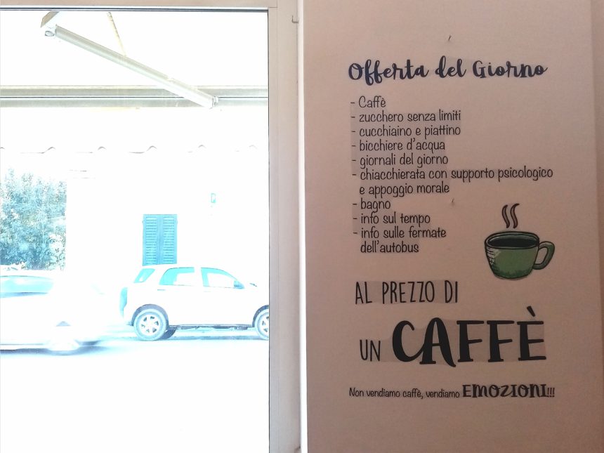 「BAR」、読みはバーでもバルでもなく、「バール」。日本語で言うと喫茶店とかカフェになり、まぁカッフェ(エスプレッソ)やお茶を飲む場所なのですが、イタリアのバールはそれ以上のもの、それはまさに「文化」なのです。上の看板に書いてある事がまさにそうで、ただの飲食店ではありません。イタリアの町に欠かせないものであり、イタリア人の生活に欠かせないものであり、そこで過ごす時間、接する人、会話・・・それらをひっくるめて全てが、イタリアのバール。